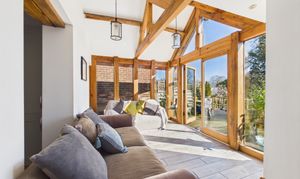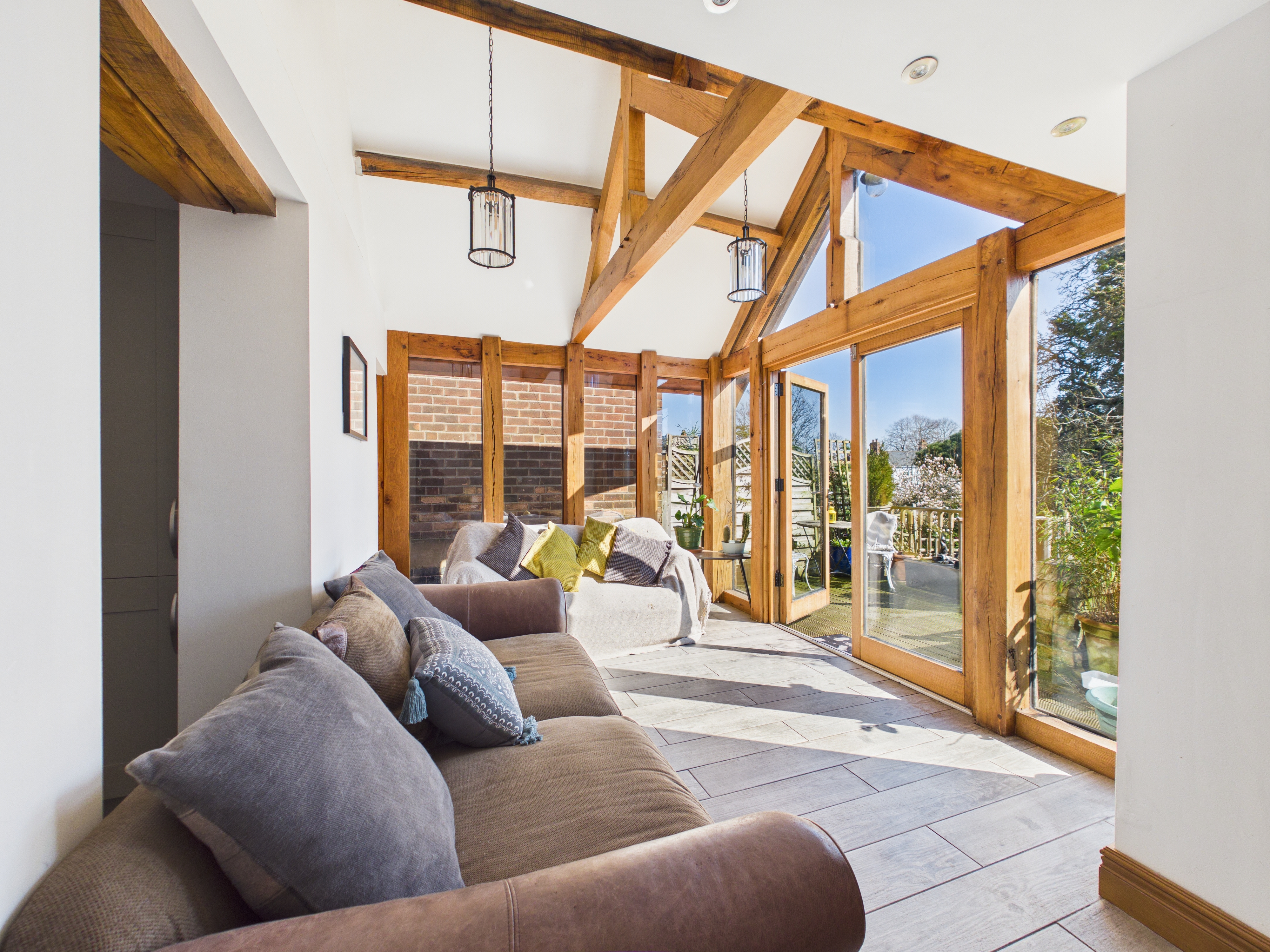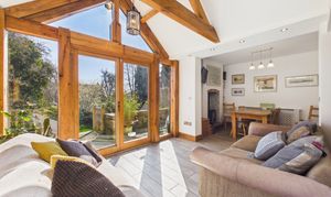 - Stunning open-plan kitchen, dining and living space with exposed oak beams and a vaulted ceiling