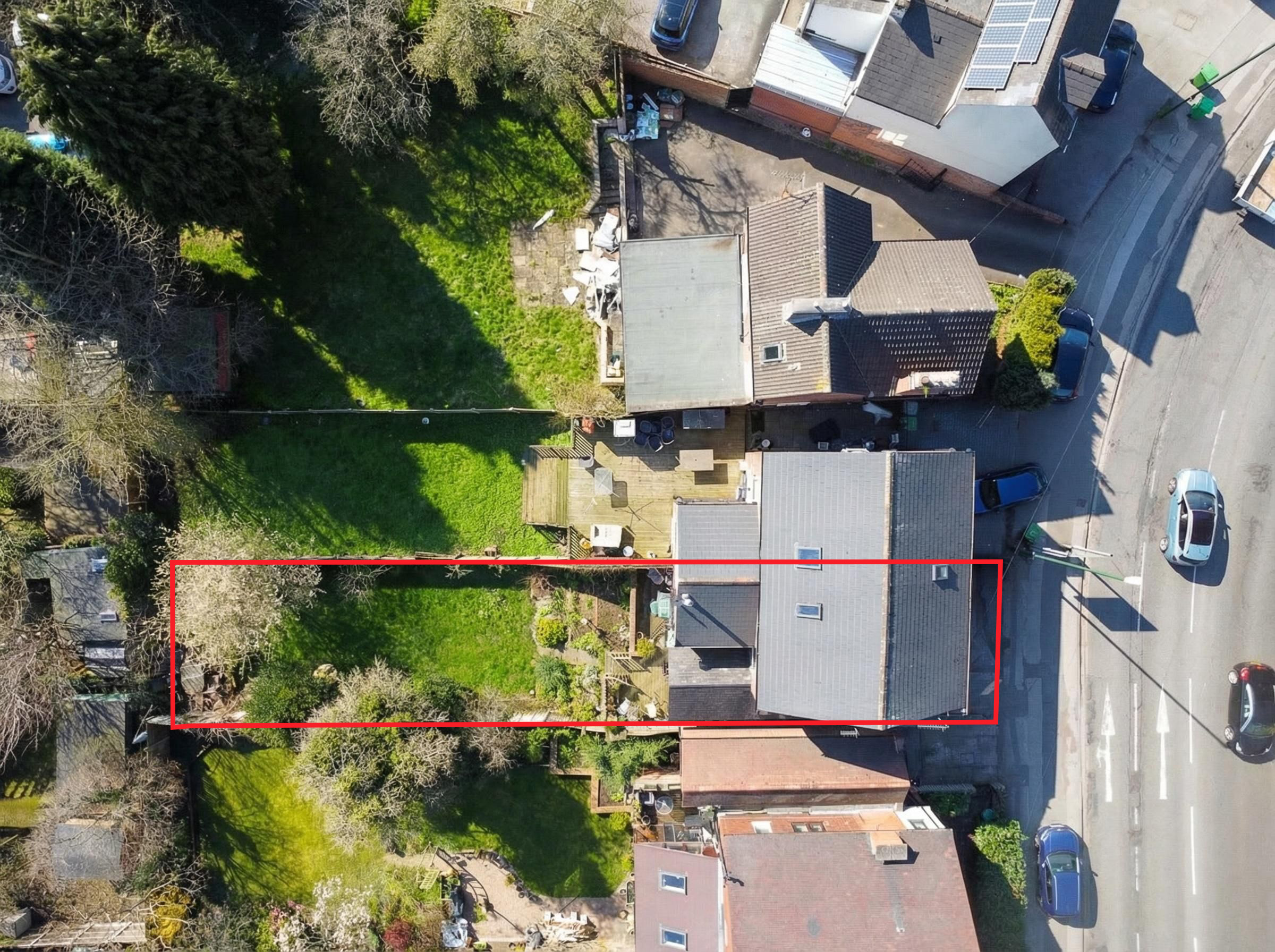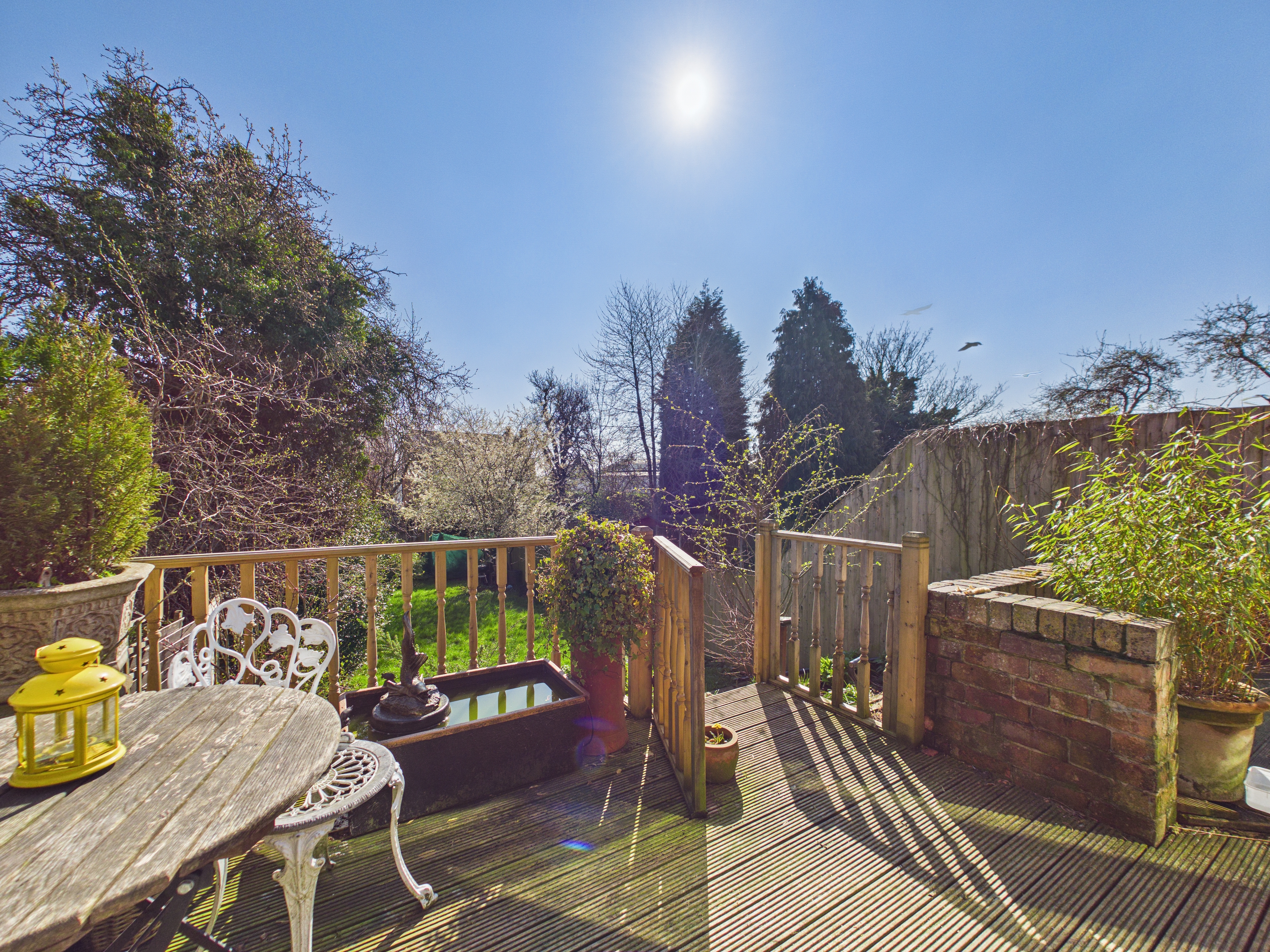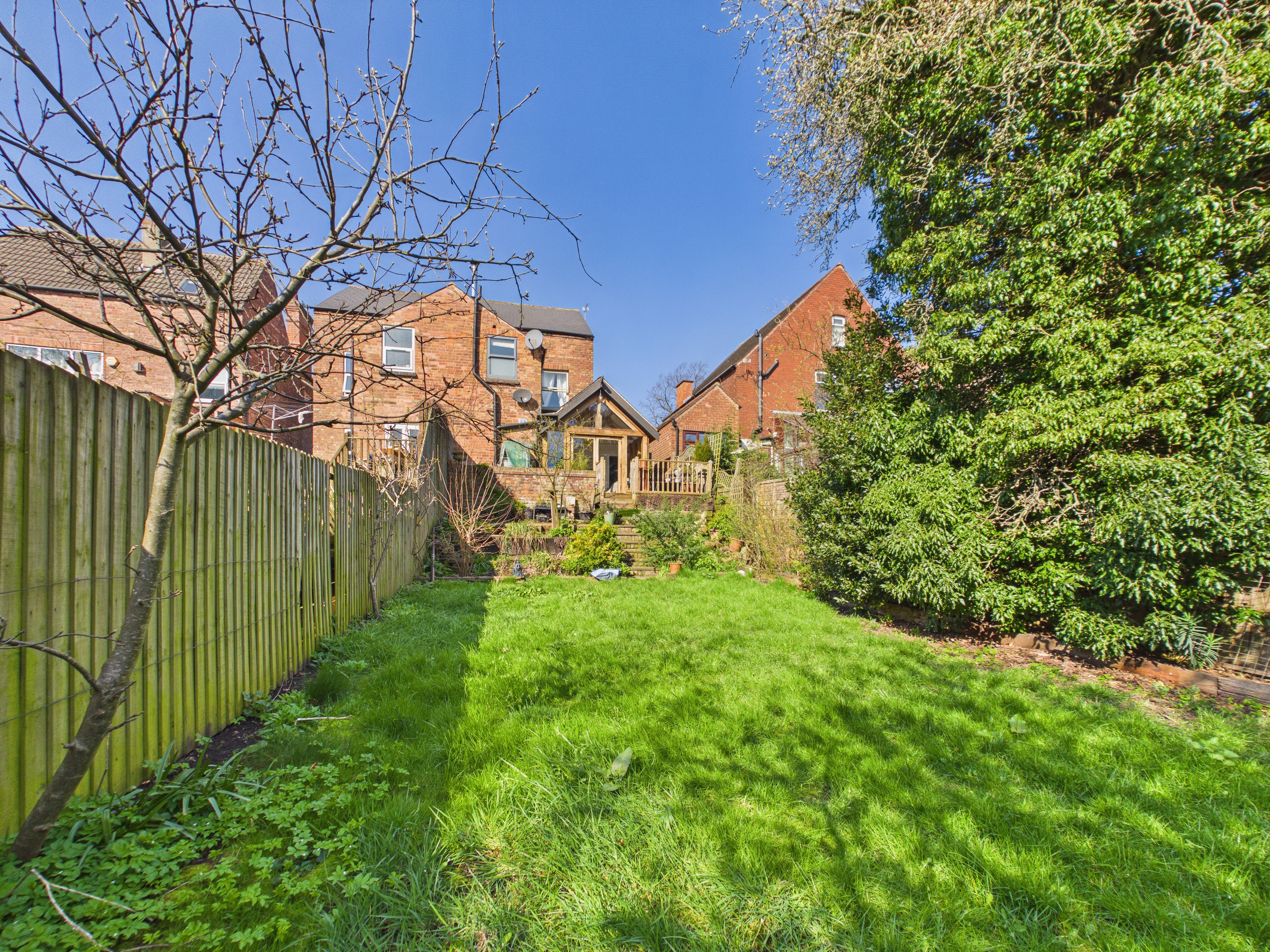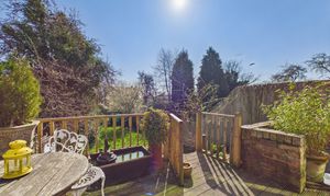 Externally, the property boasts a generous, southerly-facing rear garden. A raised decking area leads down to a lawn, enclosed by fencing and enhanced by established trees and planting, creating a private and tranquil outdoor environment.