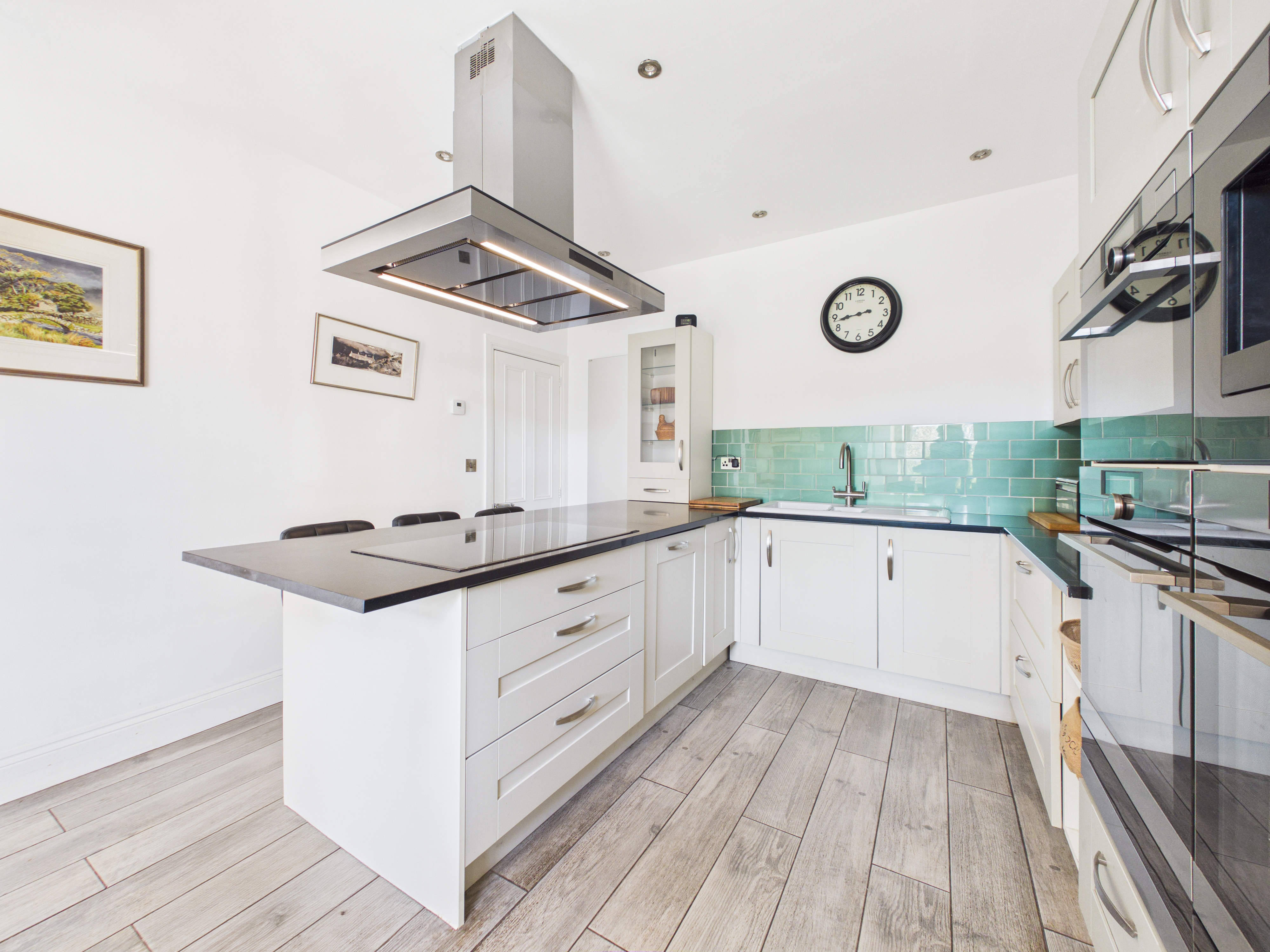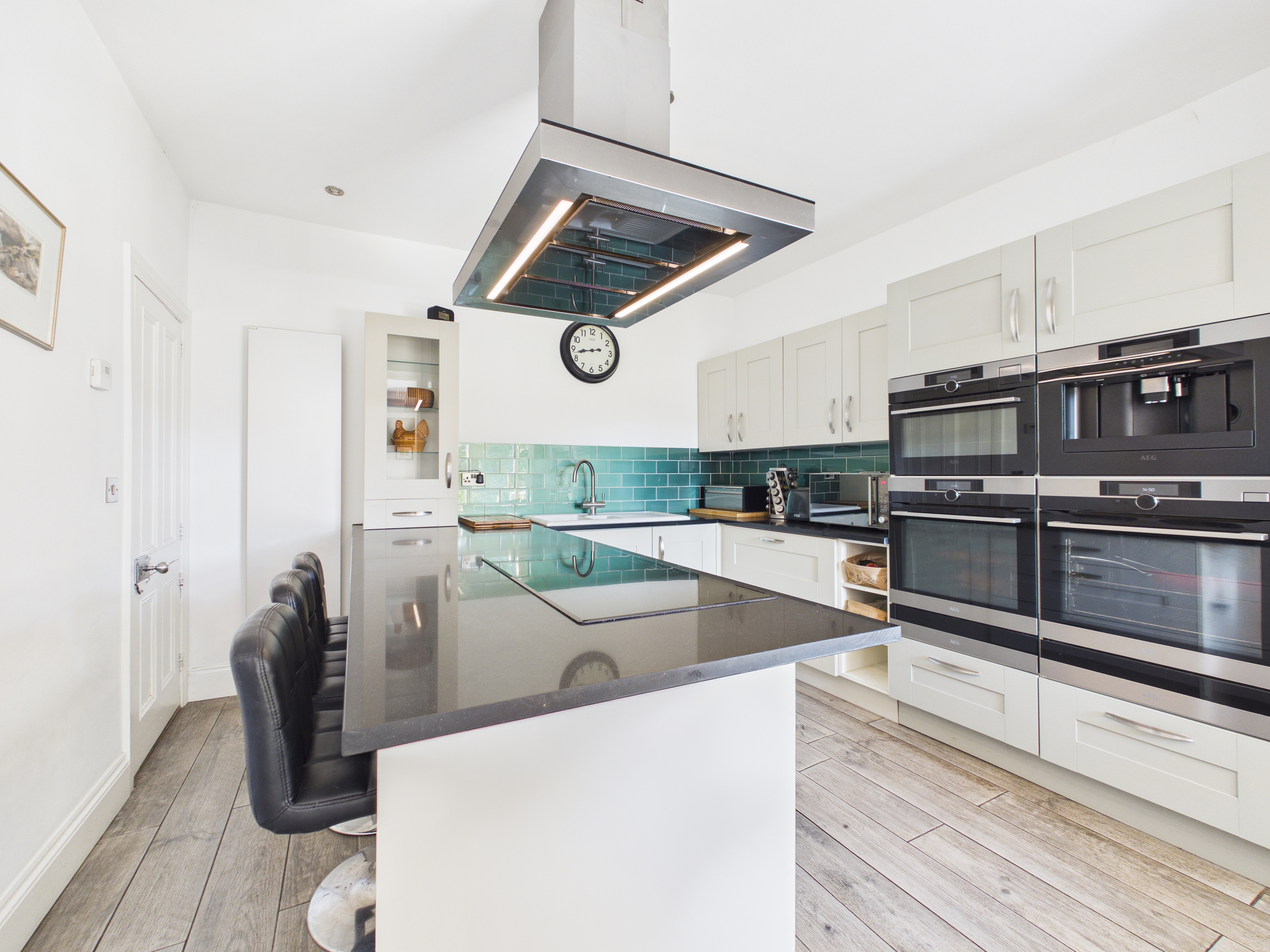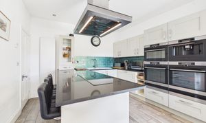 The kitchen is finished to a high specification, featuring sleek quartz worktops, a Belfast sink, and a comprehensive range of high-end integrated appliances, including double ovens, a grill and an induction hob with a contemporary ceiling-mounted extractor. A substantial central island with breakfast bar seating forms the heart of the space, ideal for informal dining and socialising. Just off the kitchen is a galley-style utility room and adjoining shower room, offering additional convenience.