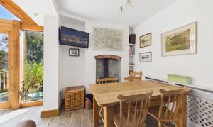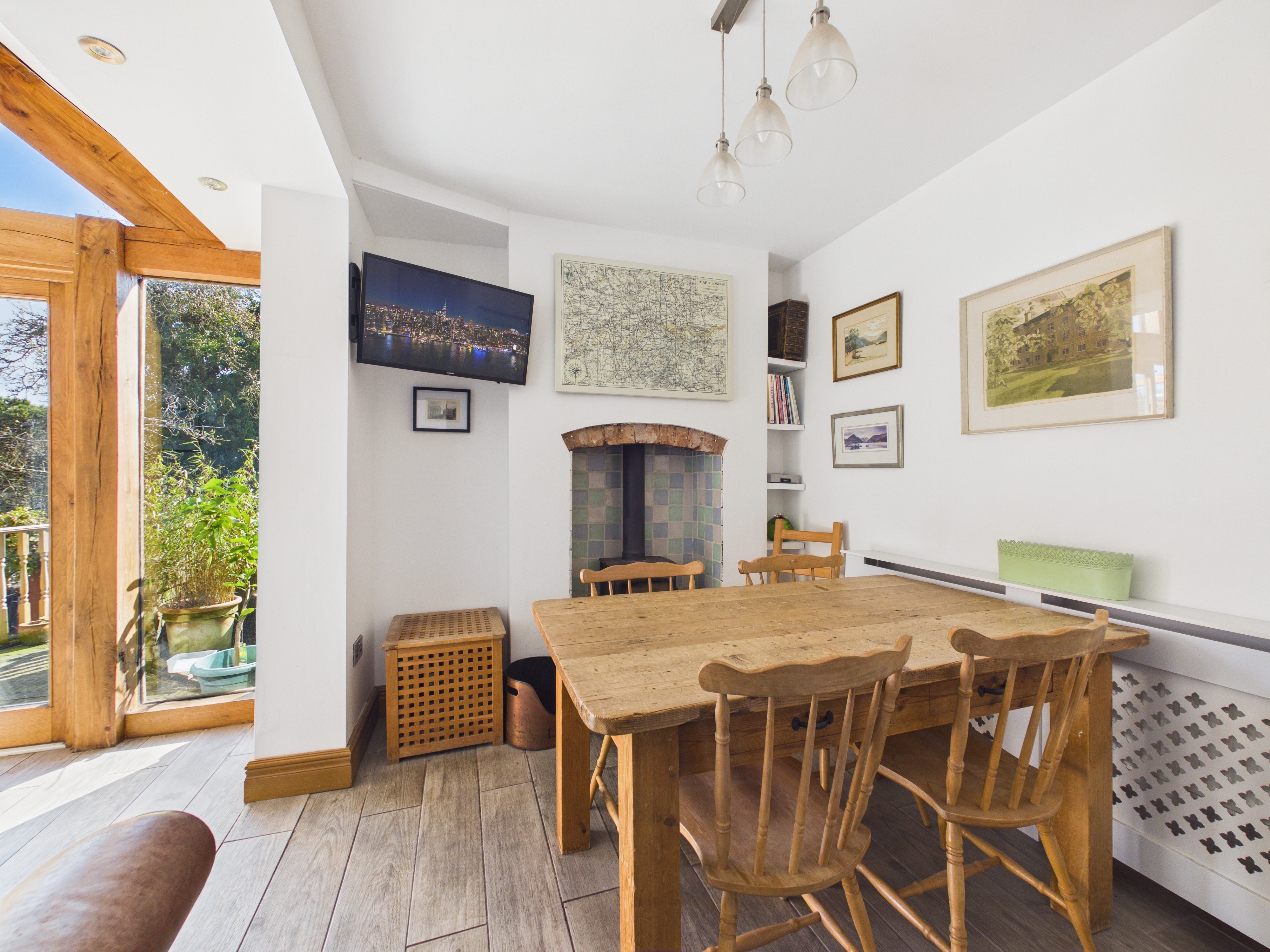 To the rear, the home truly comes into its own with a stunning open-plan kitchen, dining and living space, thoughtfully designed for modern lifestyles. This impressive extension is flooded with natural light through full-height glazing and French doors, creating a seamless connection to the outdoors. The sitting area is perfectly positioned to enjoy the garden outlook and is enhanced by a vaulted ceiling with exposed oak beams, while the dining space centres around a charming recessed fireplace with a log-burning stove, providing a cosy focal point during cooler months.