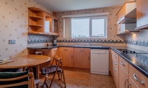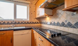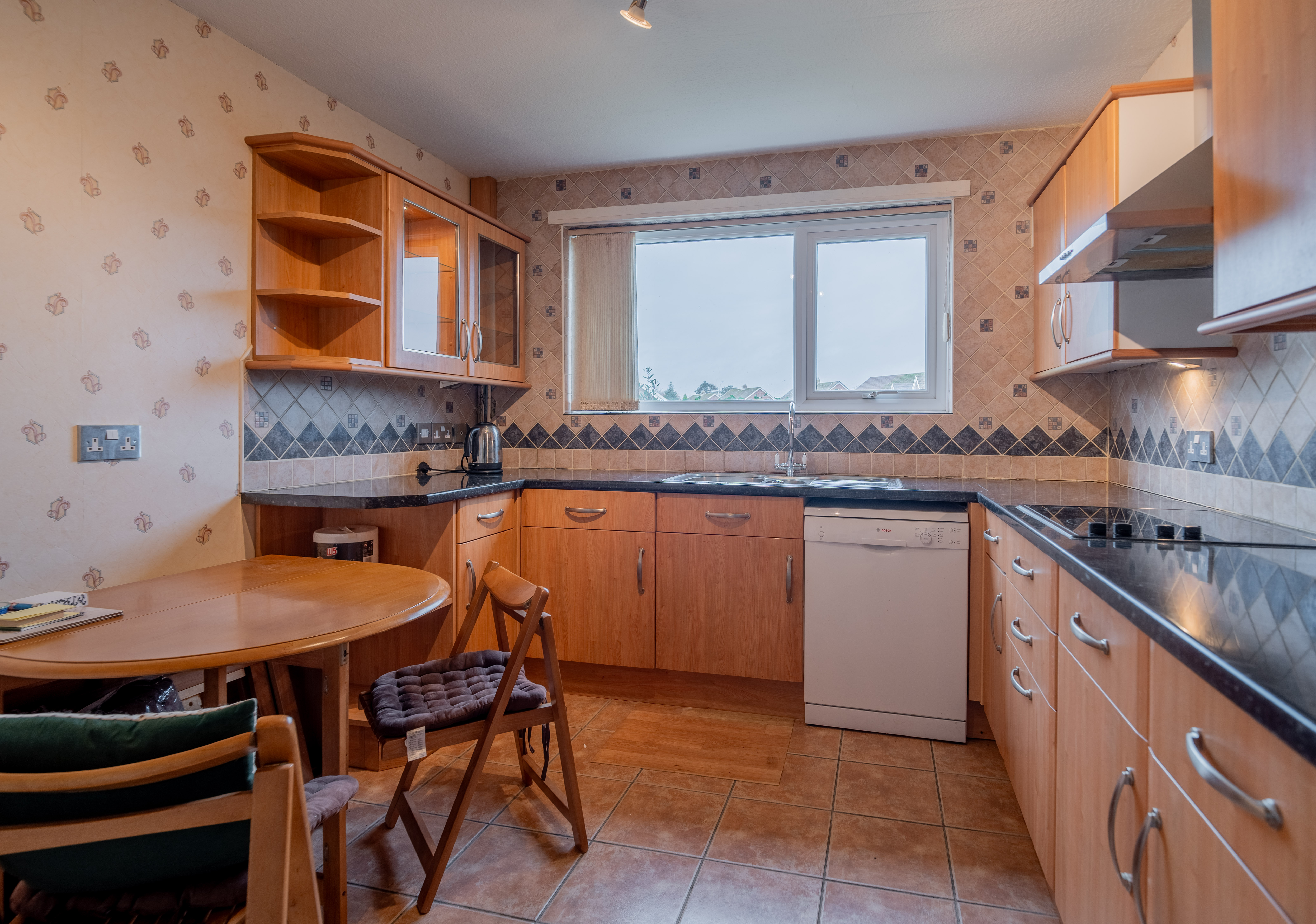 The front-aspect kitchen and breakfast room is a generous, well-designed space fitted with high-quality wooden units and a single-drainer, double-bowl stainless-steel sink with mixer tap. Practical features include a built-in double electric oven, four-ring Hotpoint ceramic hob with extractor, part-tiled walls and tiled flooring, along with ample room for a dishwasher and fridge-freezer. A spotlight rack, supplemented by inset ceiling lighting, ensures excellent illumination throughout, while a radiator provides additional comfort. With plenty of space to accommodate a breakfast table and a front-facing UPVC double-glazed window allowing good natural light, this is a large and functional family kitchen with scope for modernisation if desired.