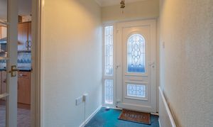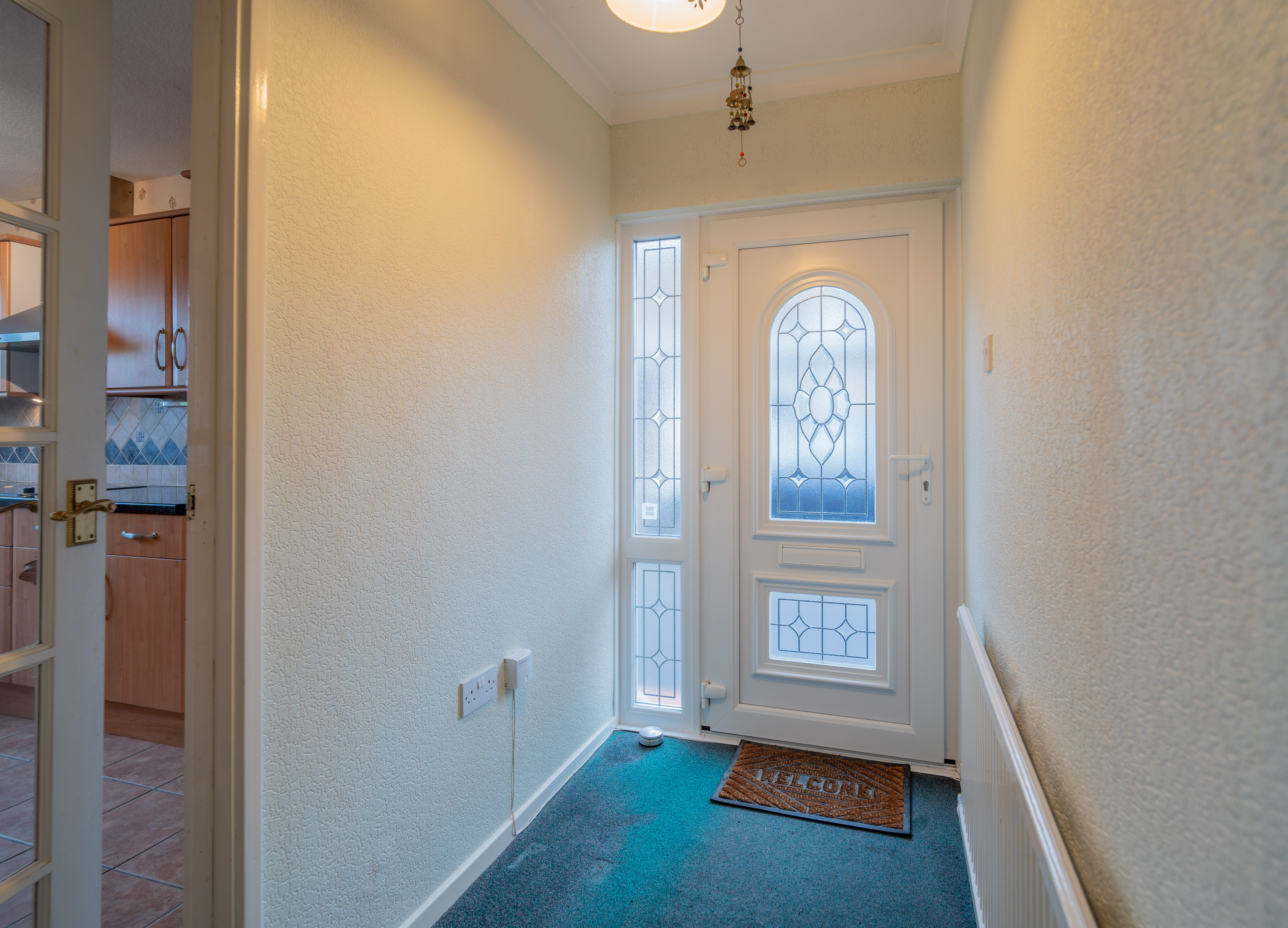 A UPVC double-glazed obscured glass front door with complementary side panel leads into a bright and practical entrance porch—ideal for everyday coats, shoes, and outdoor items.