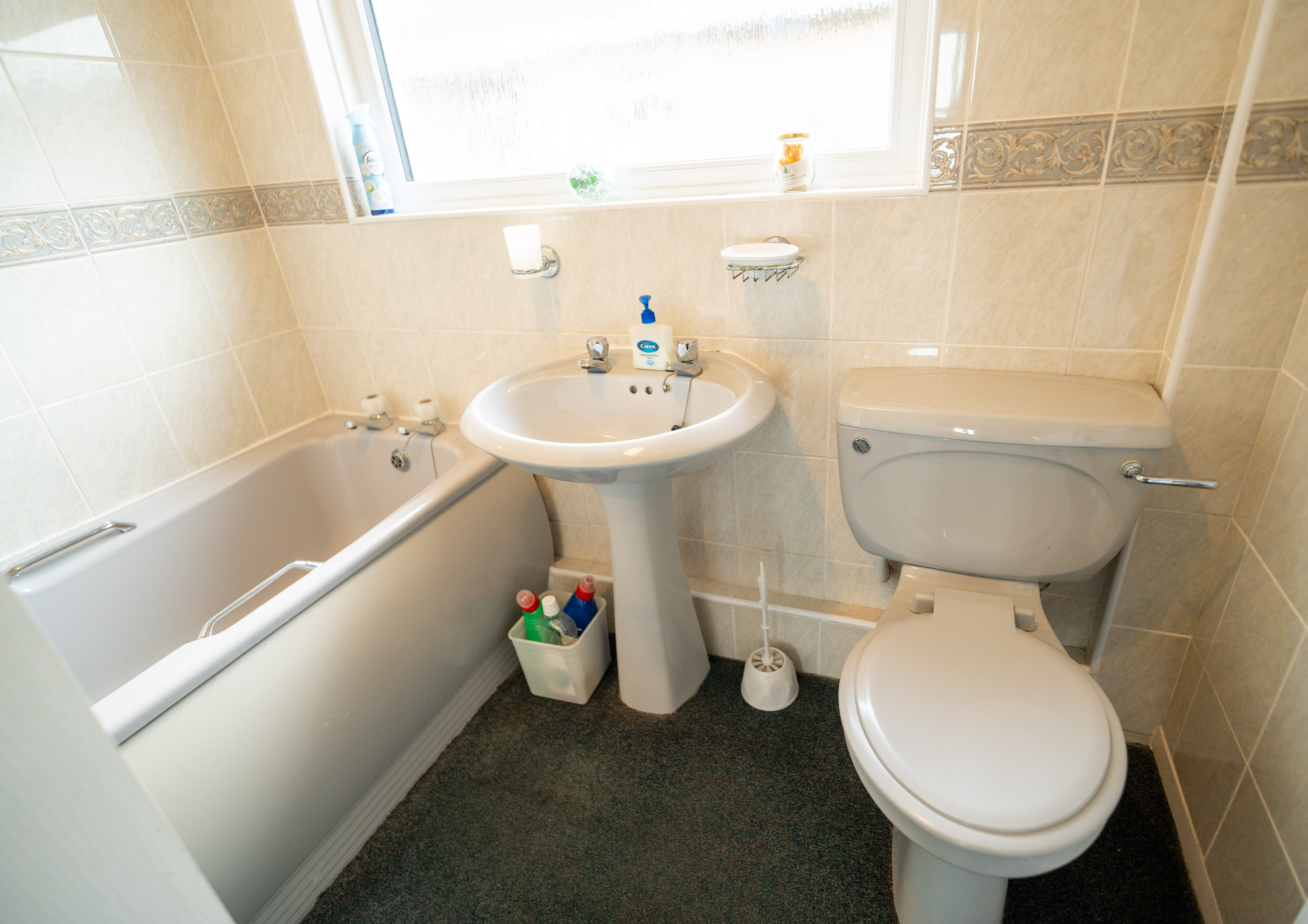 The family bathroom is neatly presented in Whisper Grey and comprises a low-level WC, pedestal wash-hand basin and a panel-enclosed bath fitted with a Mira electric wall-mounted shower, newly installed in 2024. Fully tiled walls provide a clean and practical finish, while a radiator and towel rail add comfort and convenience. Overall, it is a well-maintained and functional family bathroom.