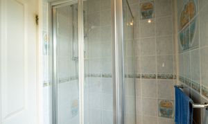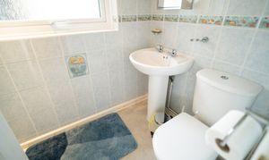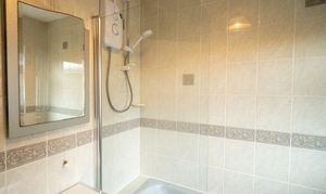 The en-suite shower room offers a practical and private arrangement, comprising a low-level WC, pedestal wash-hand basin and a walk-in shower cubicle, with the shower recently replaced in 2024. Fully tiled walls create a clean and durable finish, while a radiator and towel rail provide comfort and convenience. An obscured double-glazed window allows for natural light without compromising privacy, and the room also benefits from access to an additional loft area.