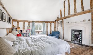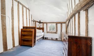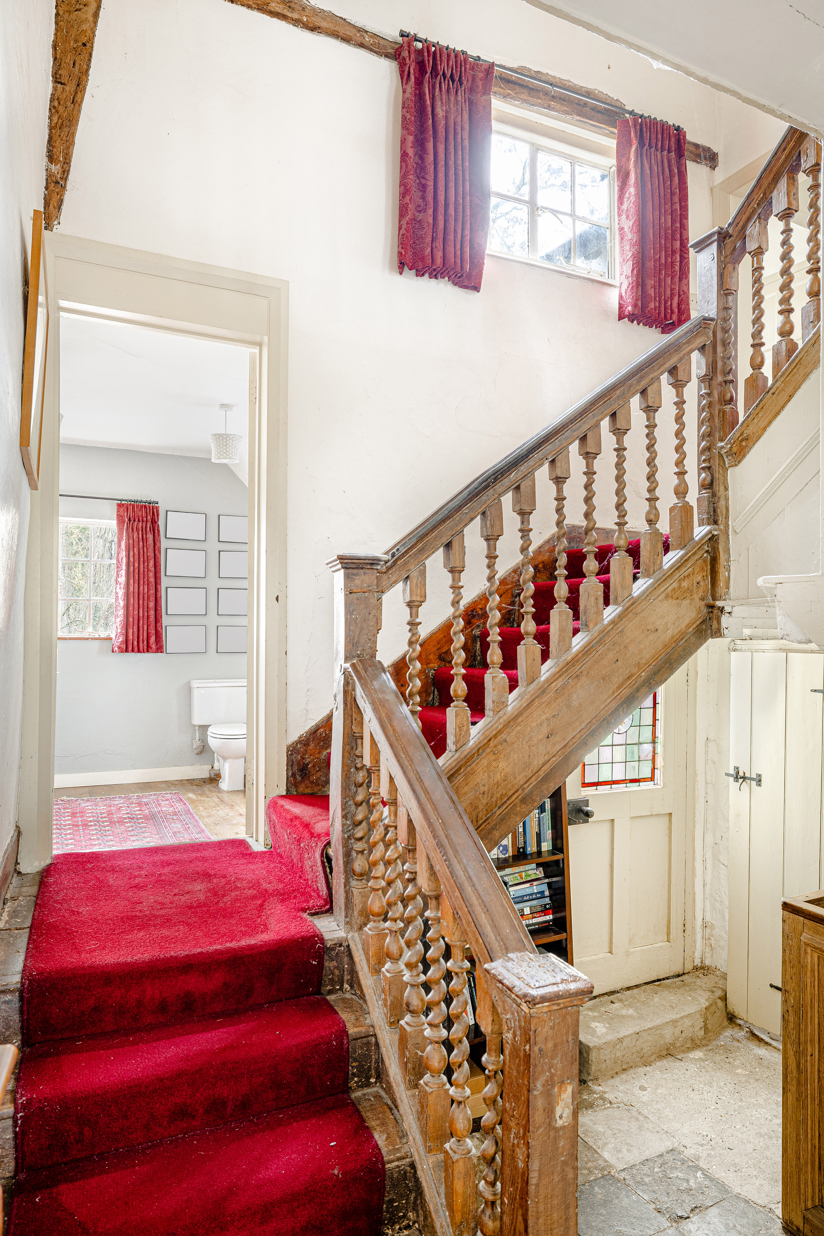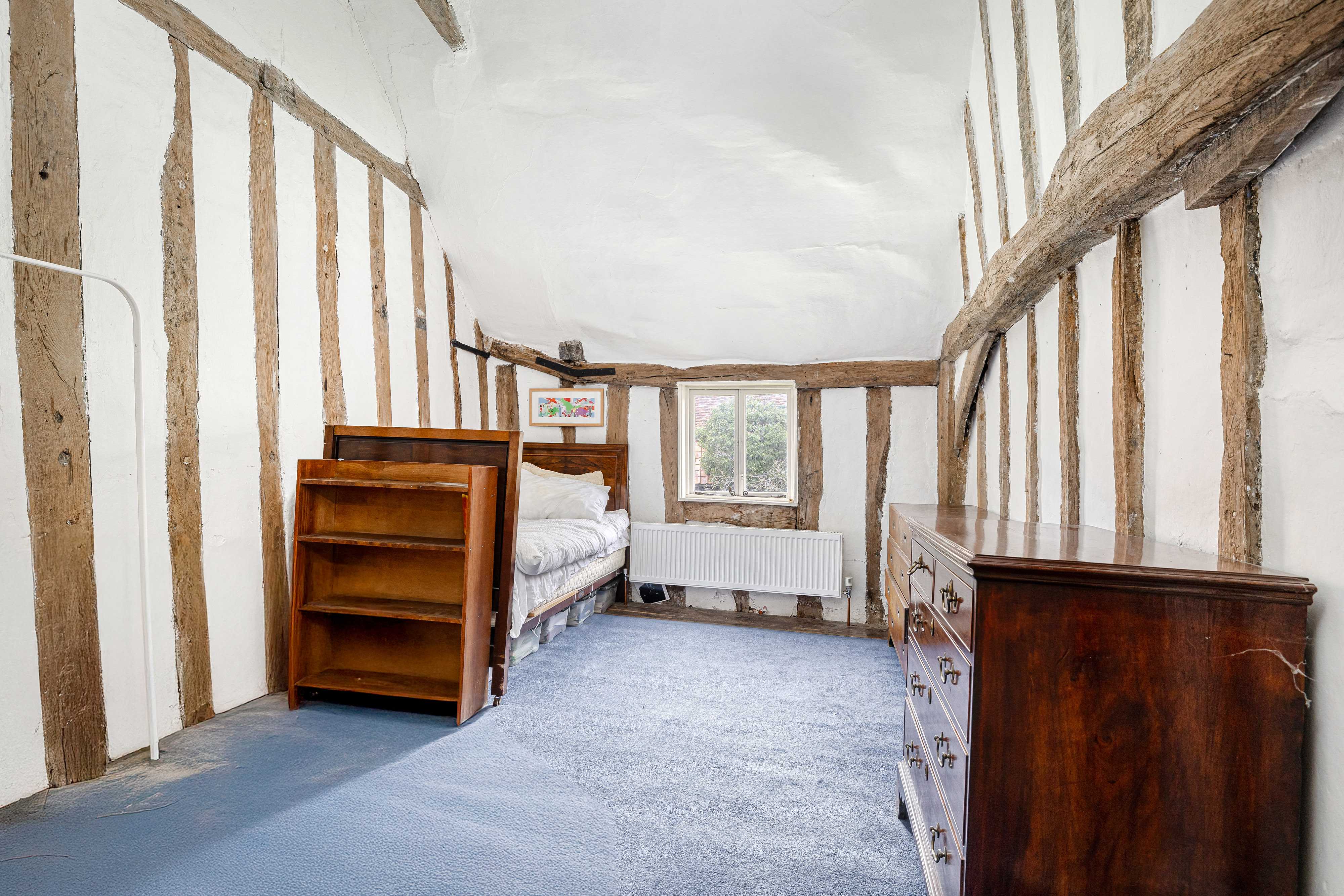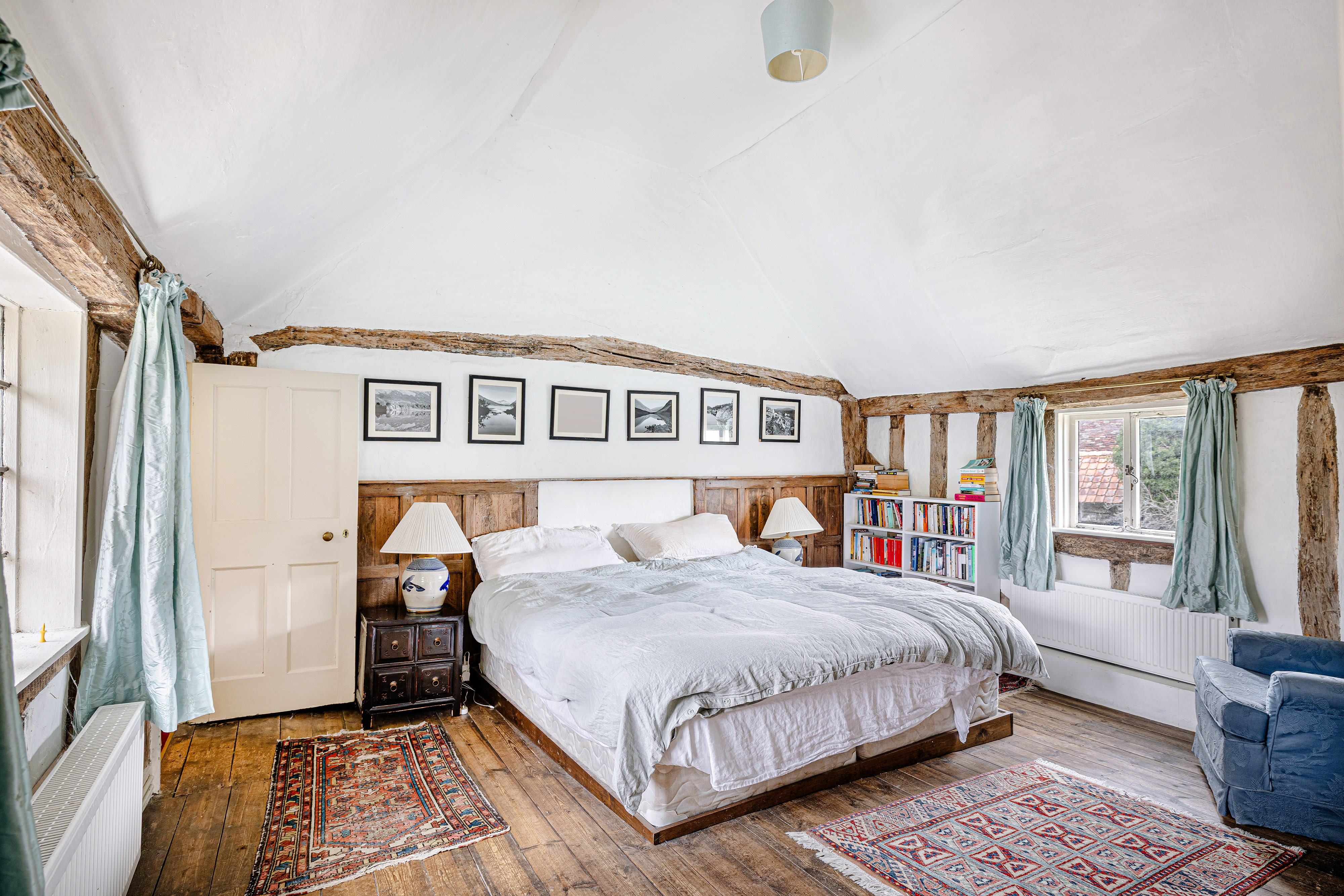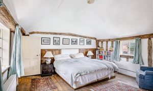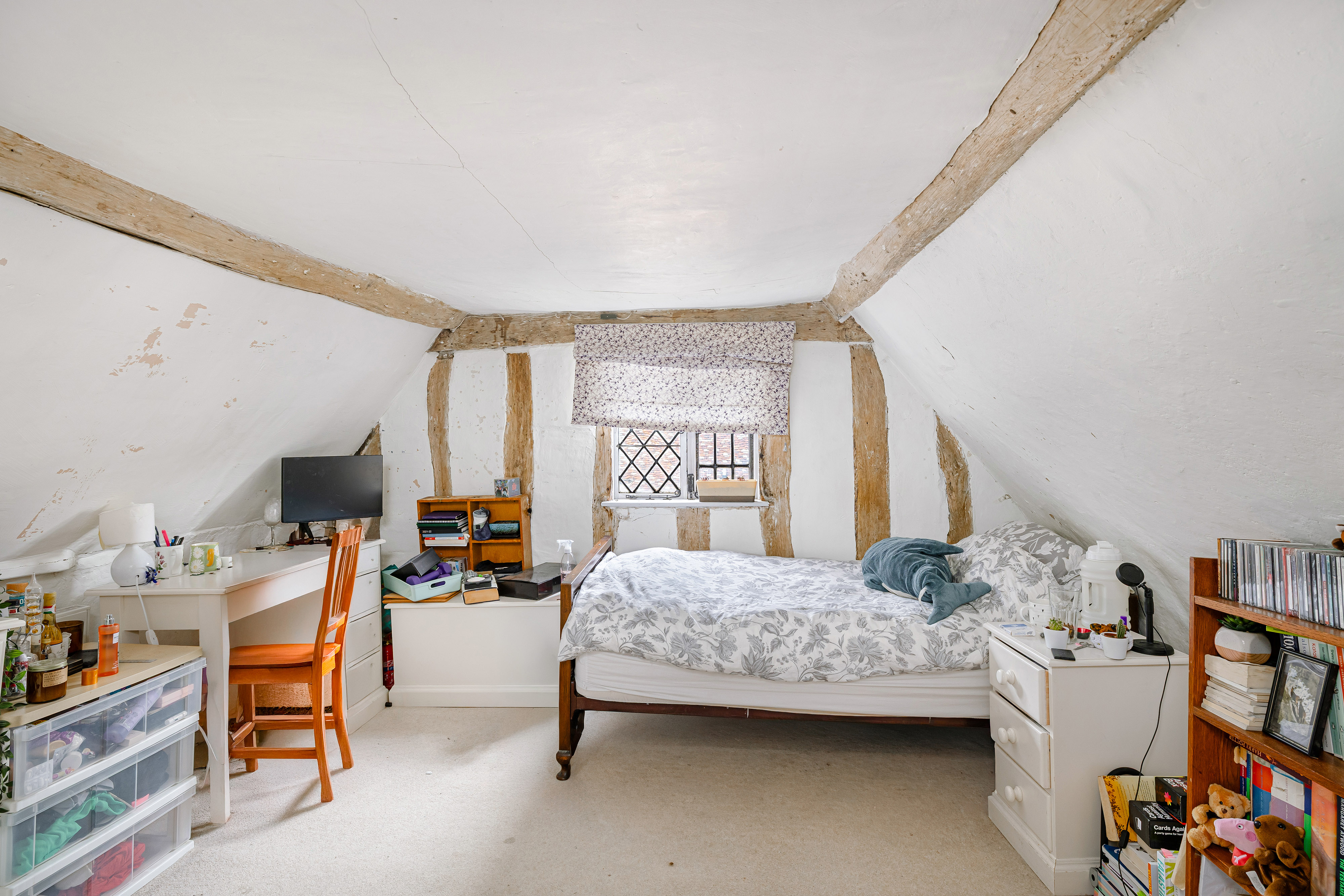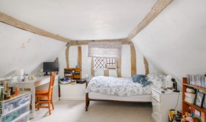 Rising to the second floor, the sixth bedroom occupies a charming and atmospheric position beneath the roofline. Here, the historic character of Crown House is perhaps at its most evocative, with exposed timber framing, gently sloping ceilings and a leaded window set within the original structure. The room offers excellent versatility, lending itself equally well as a guest bedroom, teenager’s retreat, studio or quiet home office, and provides a peaceful sense of separation from the principal accommodation below.
