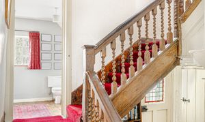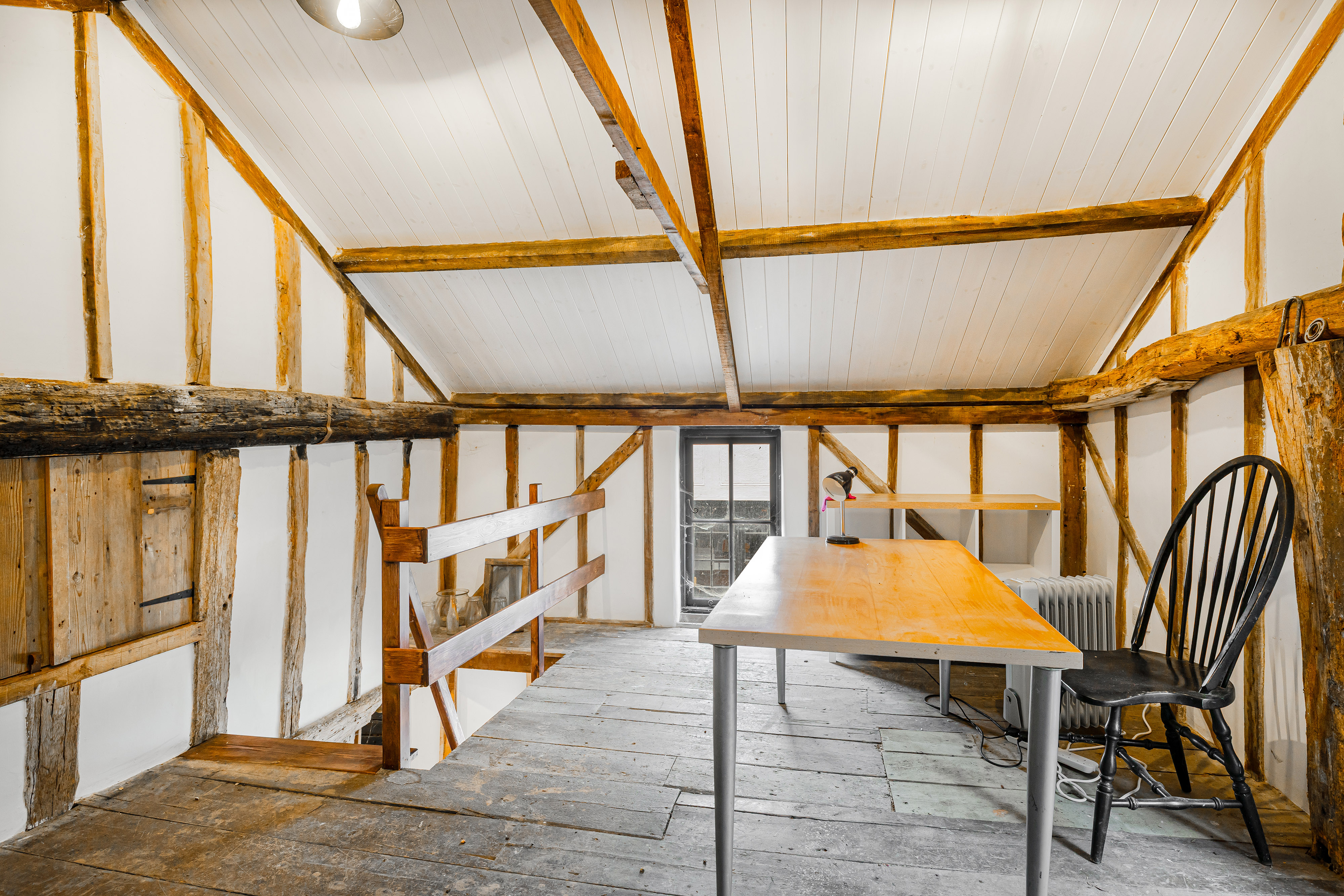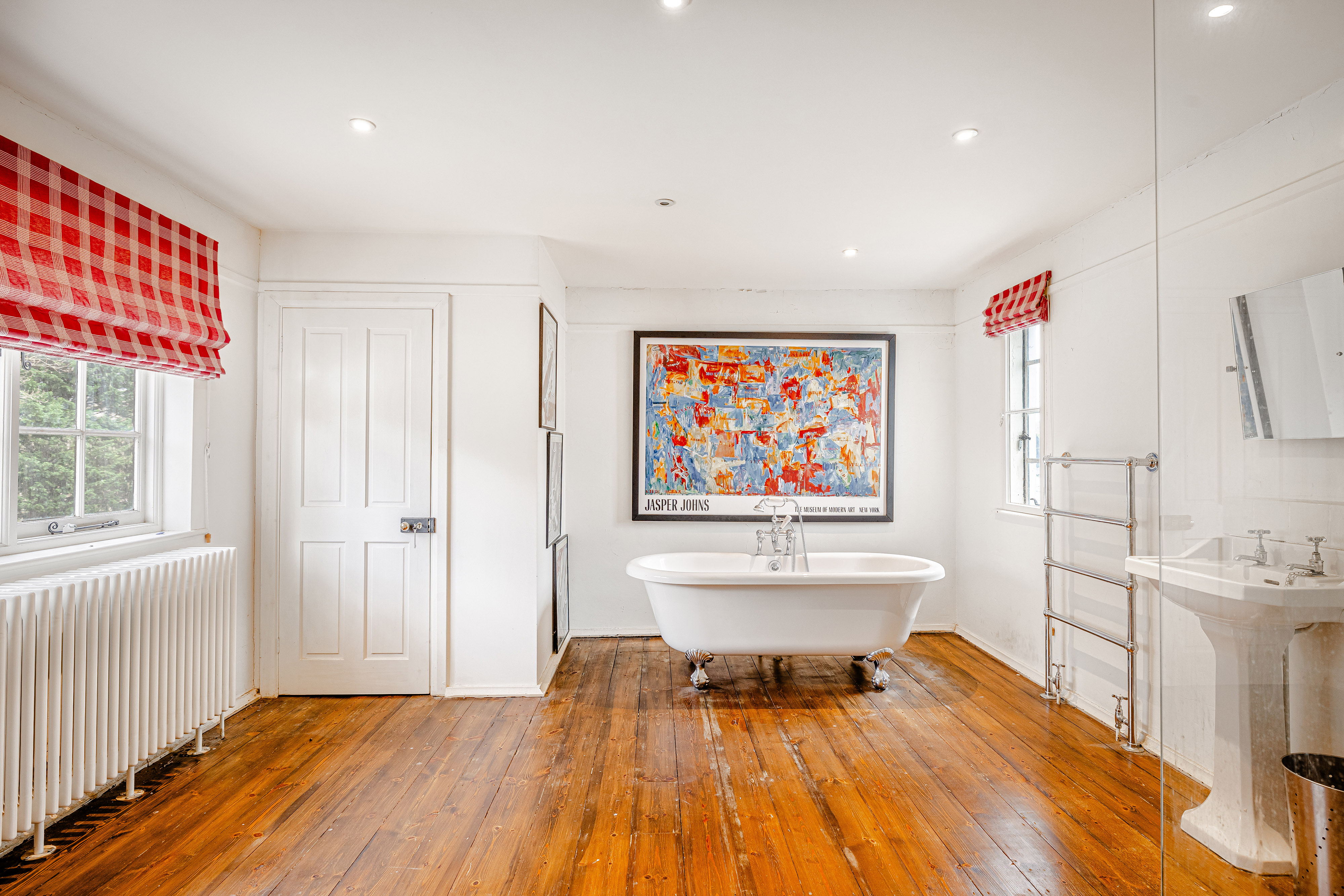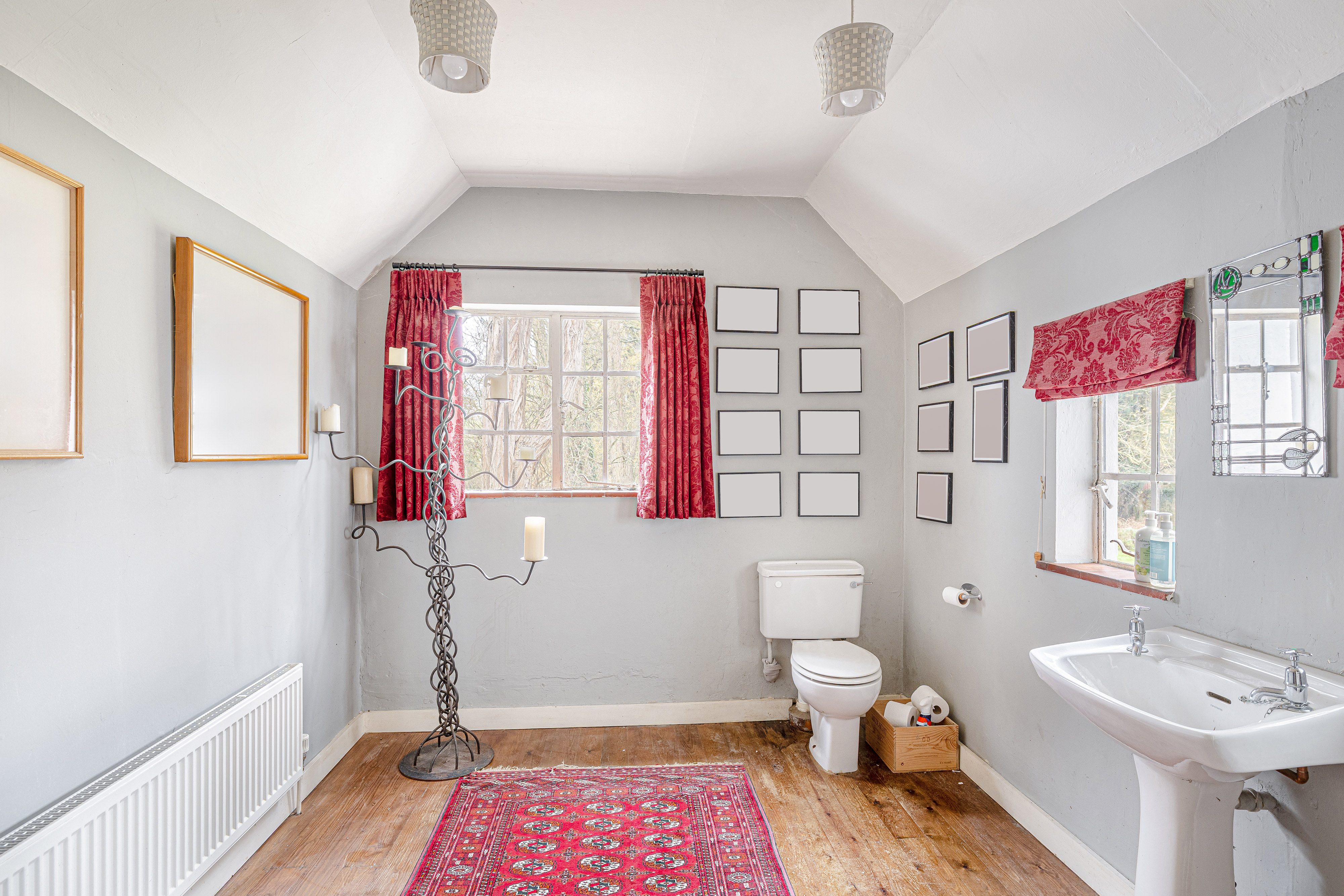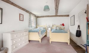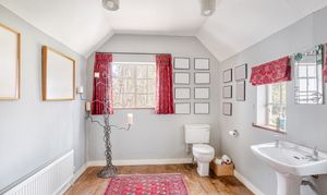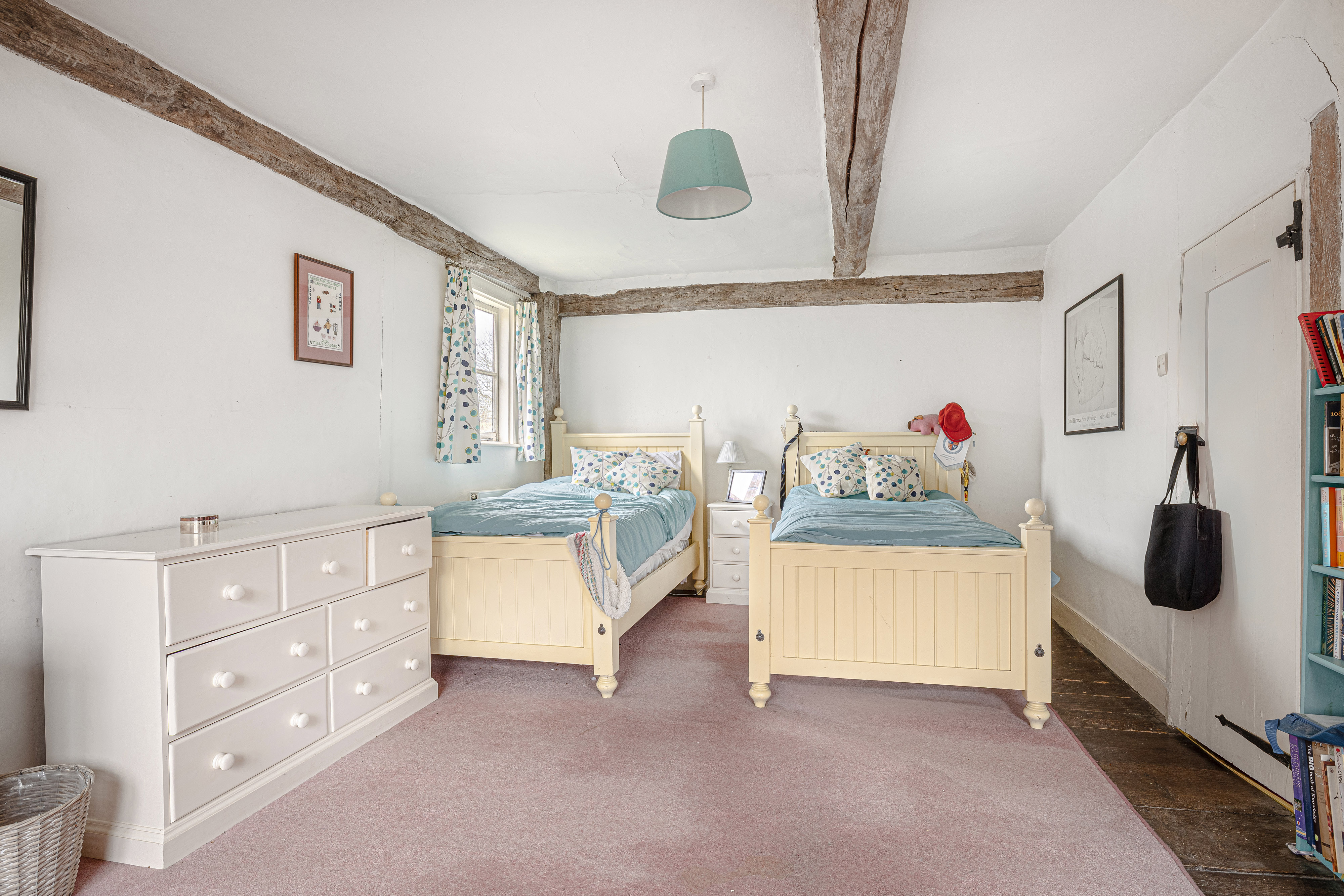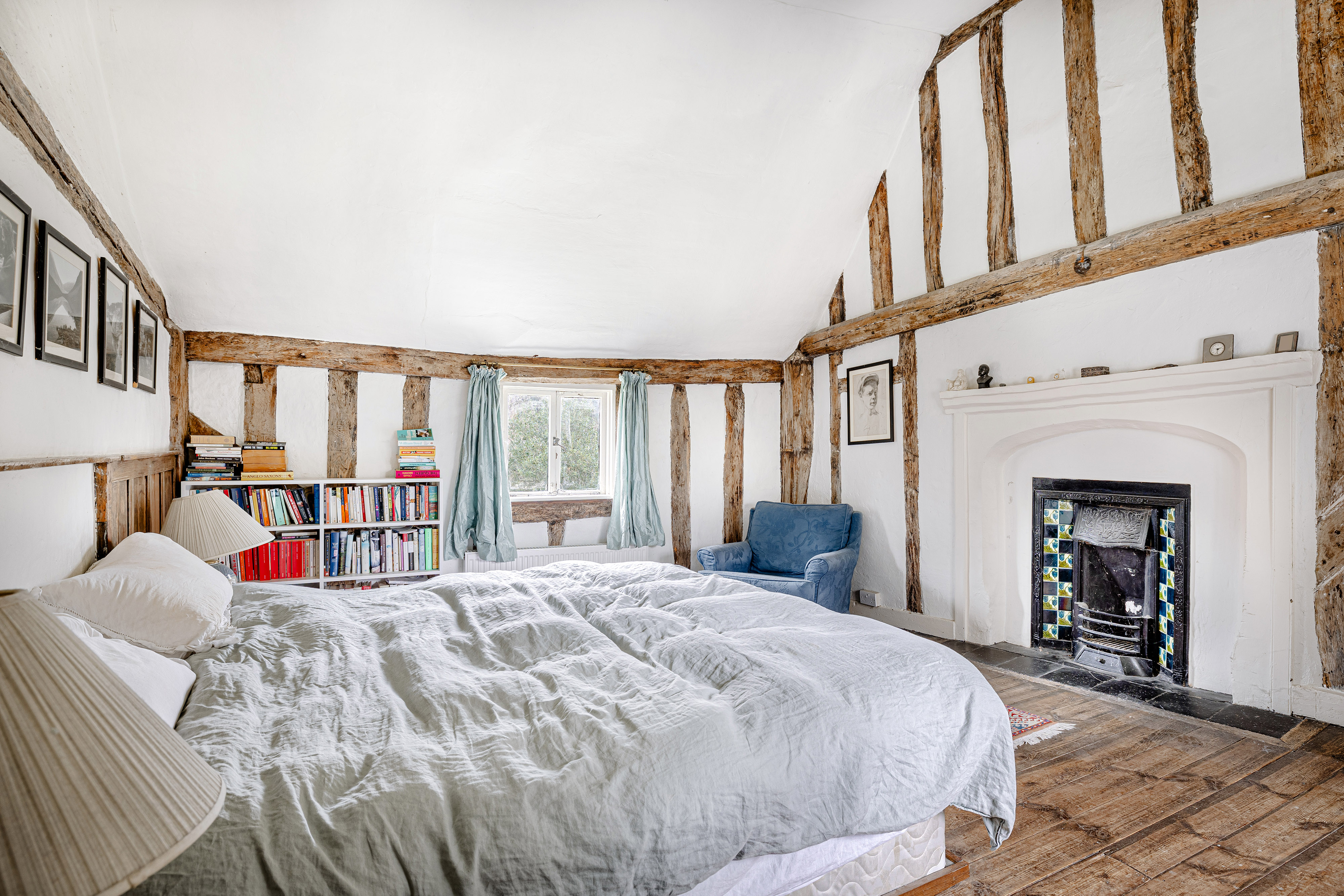 Rising to the second floor, the sixth bedroom occupies a charming and atmospheric position beneath the roofline. Here, the historic character of Crown House is perhaps at its most evocative, with exposed timber framing, gently sloping ceilings and a leaded window set within the original structure. The room offers excellent versatility, lending itself equally well as a guest bedroom, teenager’s retreat, studio or quiet home office, and provides a peaceful sense of separation from the principal accommodation below.