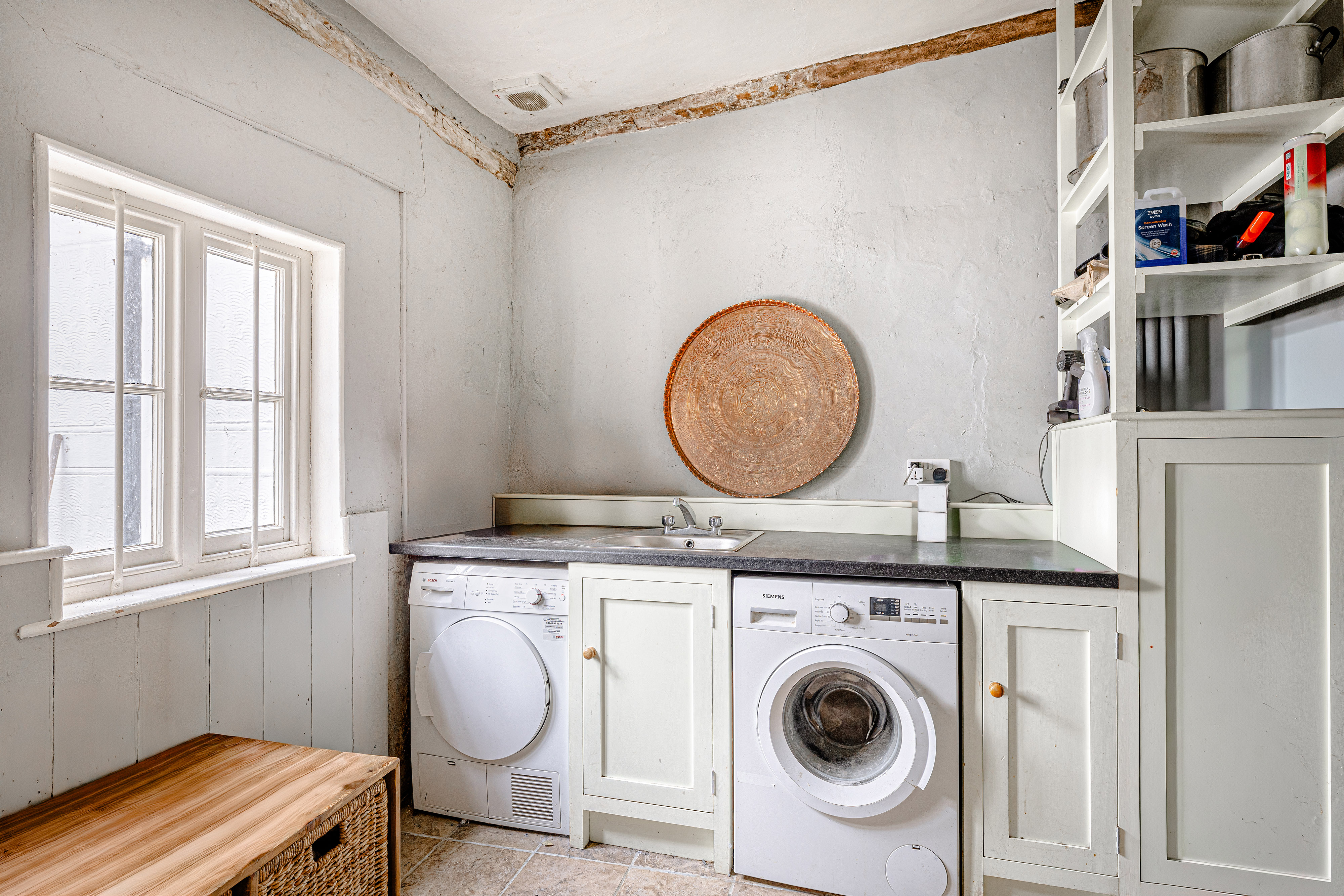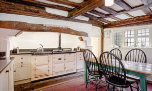 At the heart of the home sits the kitchen, a wonderfully atmospheric space that balances historic charm with everyday practicality. Set beneath a canopy of exposed beams, the kitchen is centred around an AGA, complemented by bespoke cabinetry, generous preparation space and room for a large farmhouse table. Adjoining utility, pantry and laundry rooms ensure the working areas of the house are discreet yet highly functional, ideal for modern family life within a period setting.