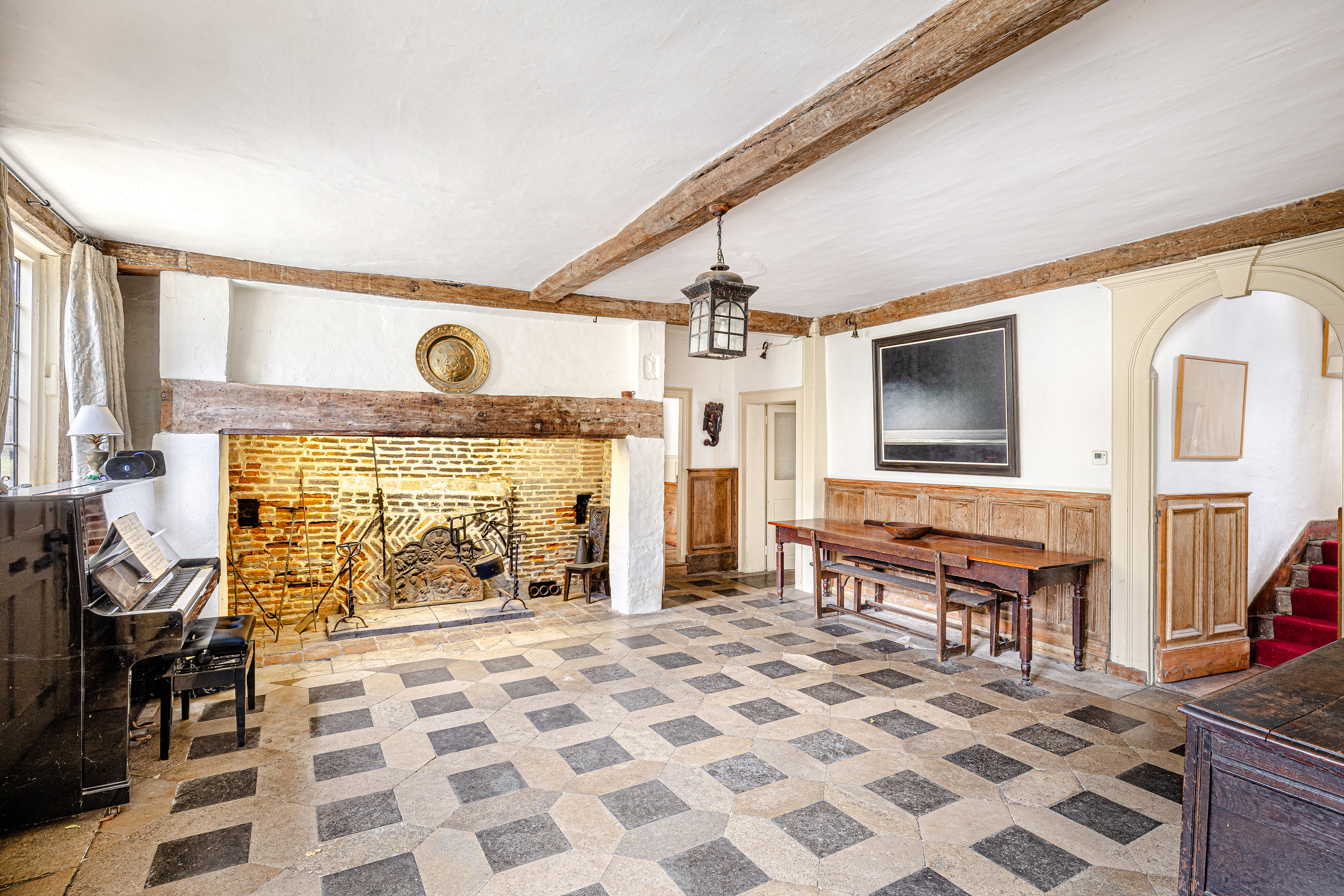 The ground floor is rich in character and atmosphere, offering a series of elegant reception rooms that speak to the home’s heritage and craftsmanship. Original exposed timber beams, wide plank flooring and beautifully detailed wall panelling are evident throughout, while a number of inglenook and open fireplaces provide natural focal points. The principal reception rooms offer both grandeur and intimacy, equally suited to formal entertaining or relaxed family living. A particularly impressive dining room that features a classic fireplace, while the main sitting rooms showcase exceptional ceiling timbers and proportions rarely found in such complete form.