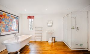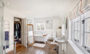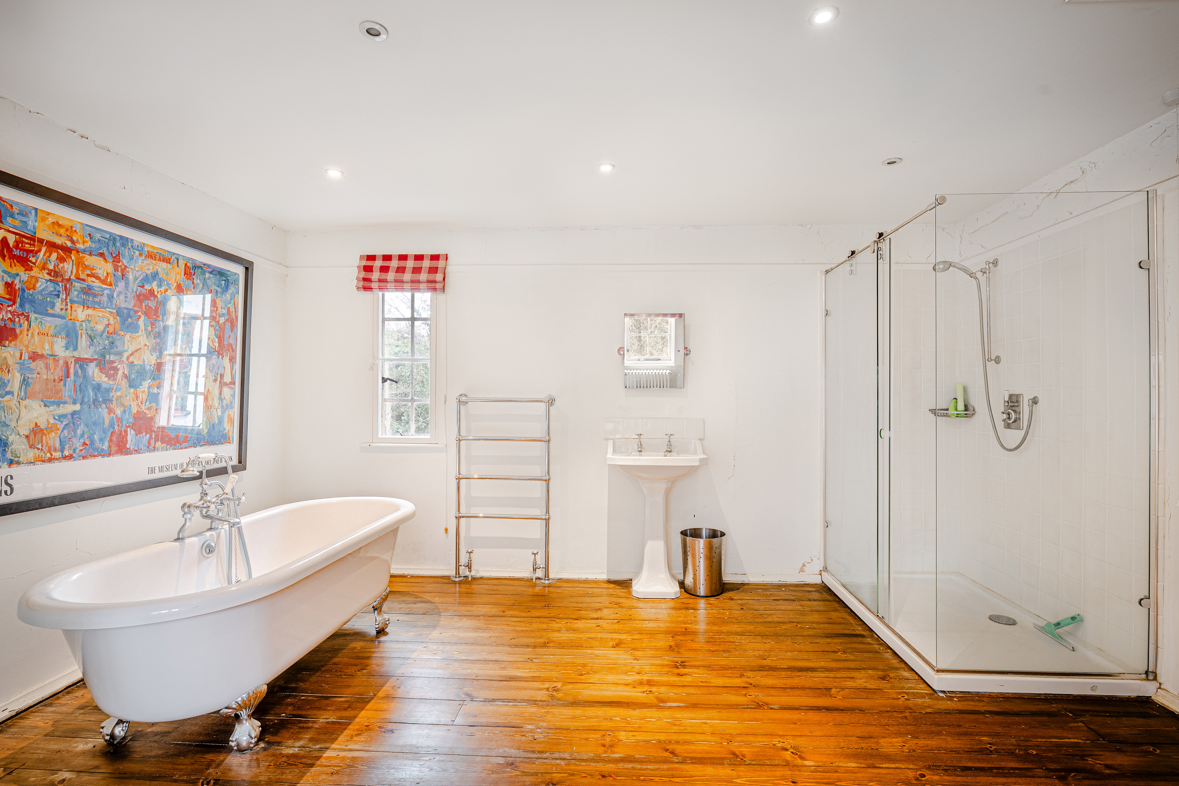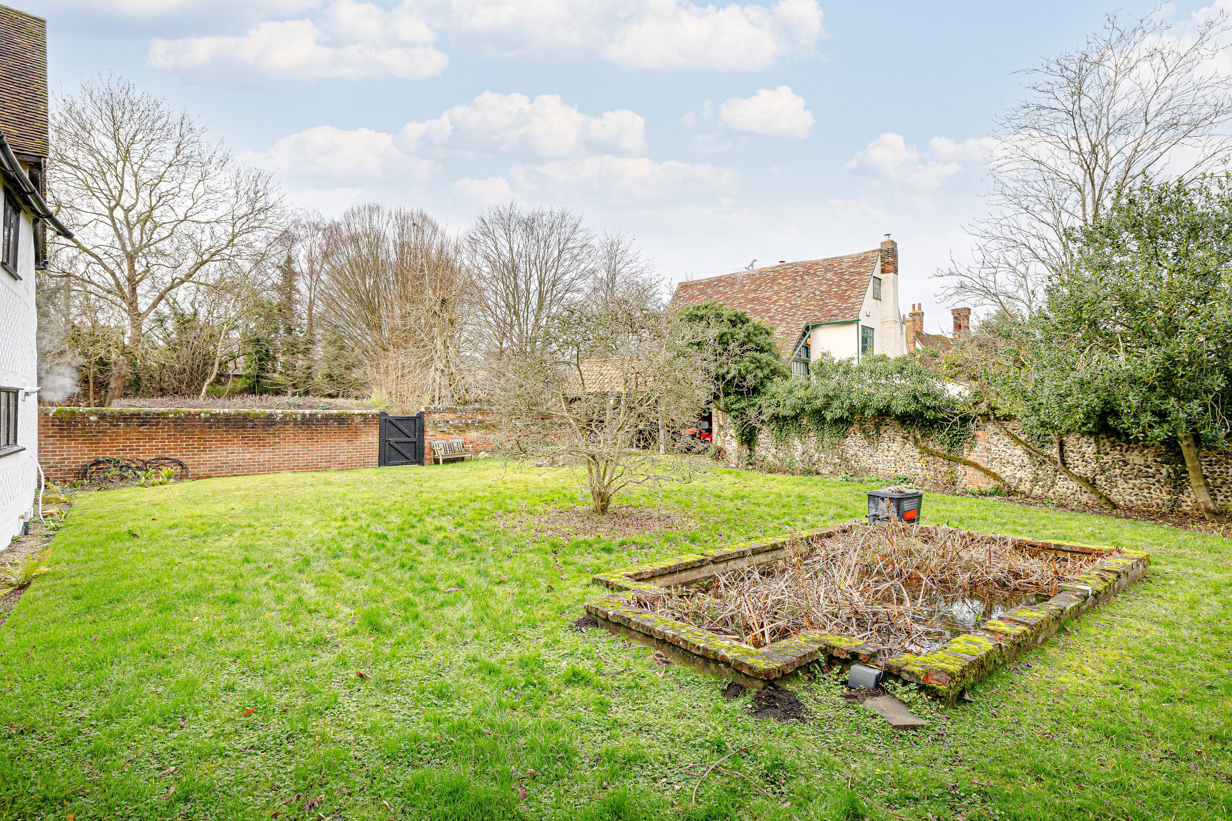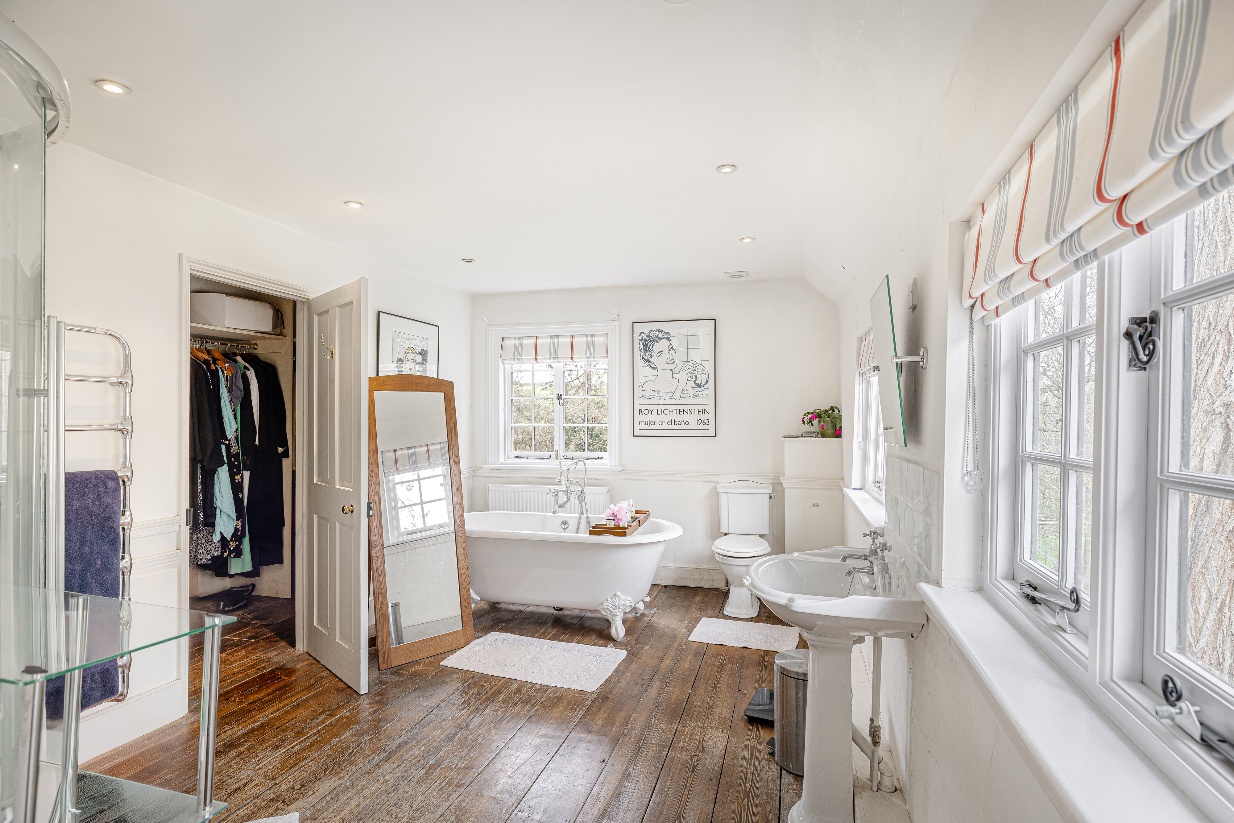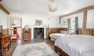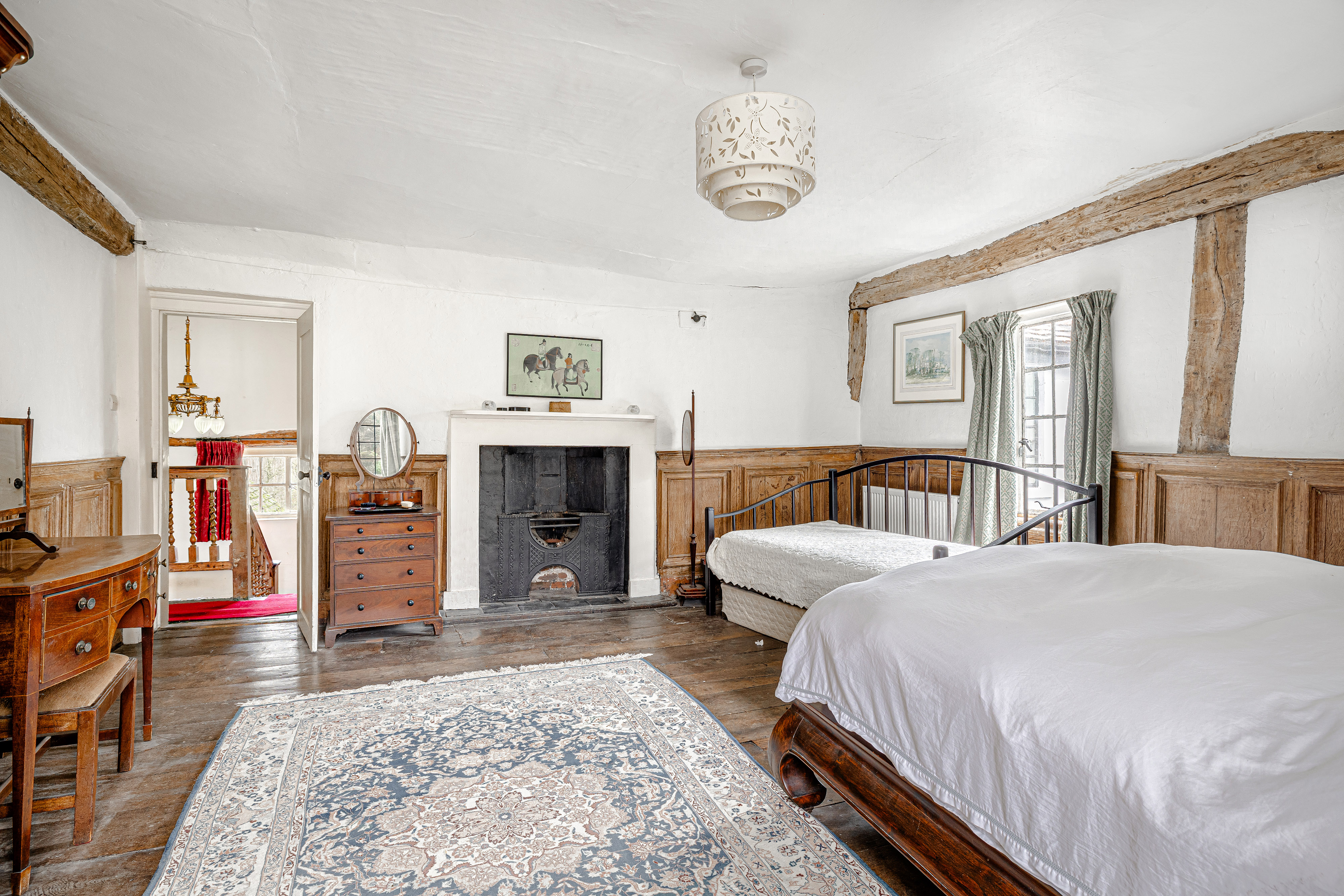 The first floor provides five beautifully proportioned bedrooms, each retaining the character expected of a house of this calibre. Exposed timbers, original fireplaces, leaded casement windows and historic panelling are recurring features, while outlooks extend across both the mature gardens and the historic street scene to the front. The principal bedroom suite is a particularly impressive space, offering generous proportions, a wealth of character and an adjoining stylish en-suite bathroom with a freestanding bath and a separate shower leading to a dressing area. Additional bathrooms and shower rooms serve the remaining bedrooms, combining traditional fittings with modern convenience.
