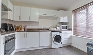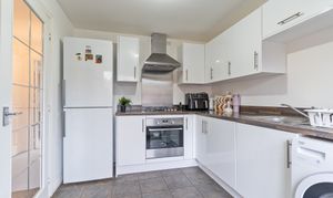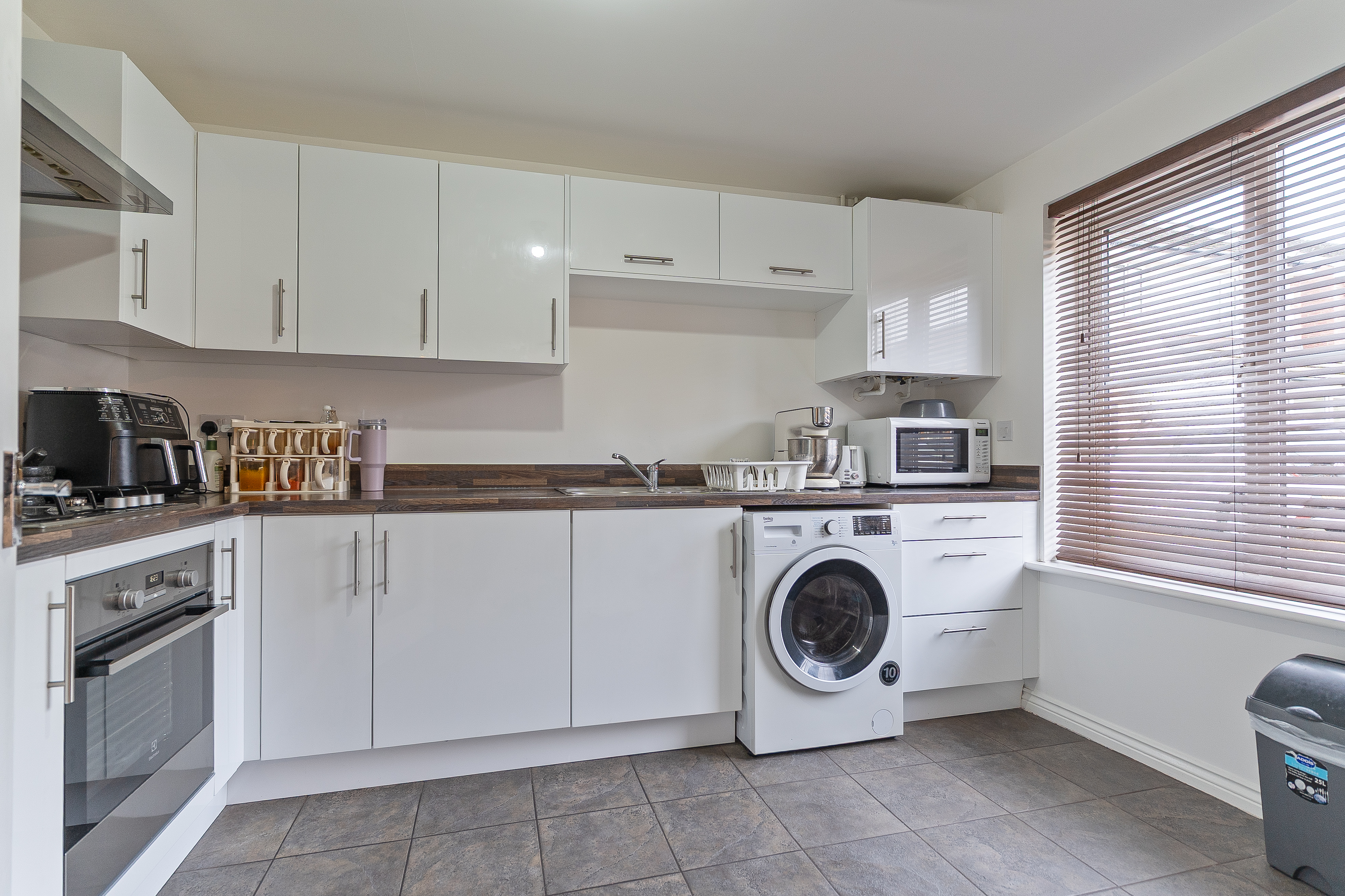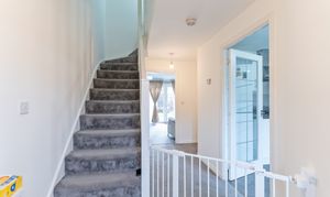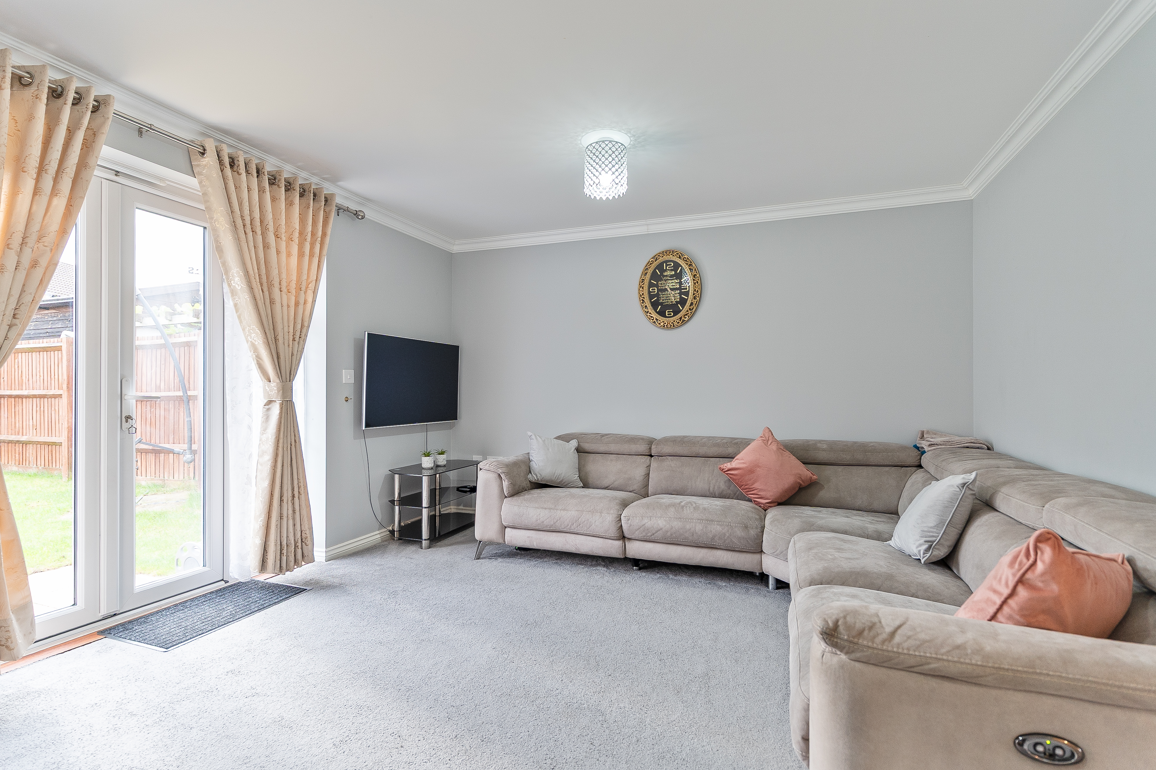 On the ground floor, the hallway provides access to the main living areas, the convenient cloakroom, and the staircase to the first floor. To the rear of the property lies the bright and spacious lounge/diner, which spans the full width of the home and offers an ideal space for relaxing and entertaining, with French doors opening onto the garden. To the right, the modern fitted kitchen/breakfast room features a stylish range of units, ample worktop space, and integrated appliances, creating a practical yet sociable family space.