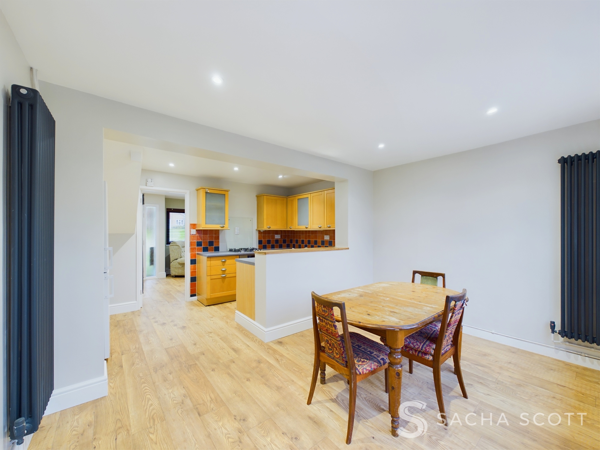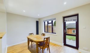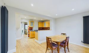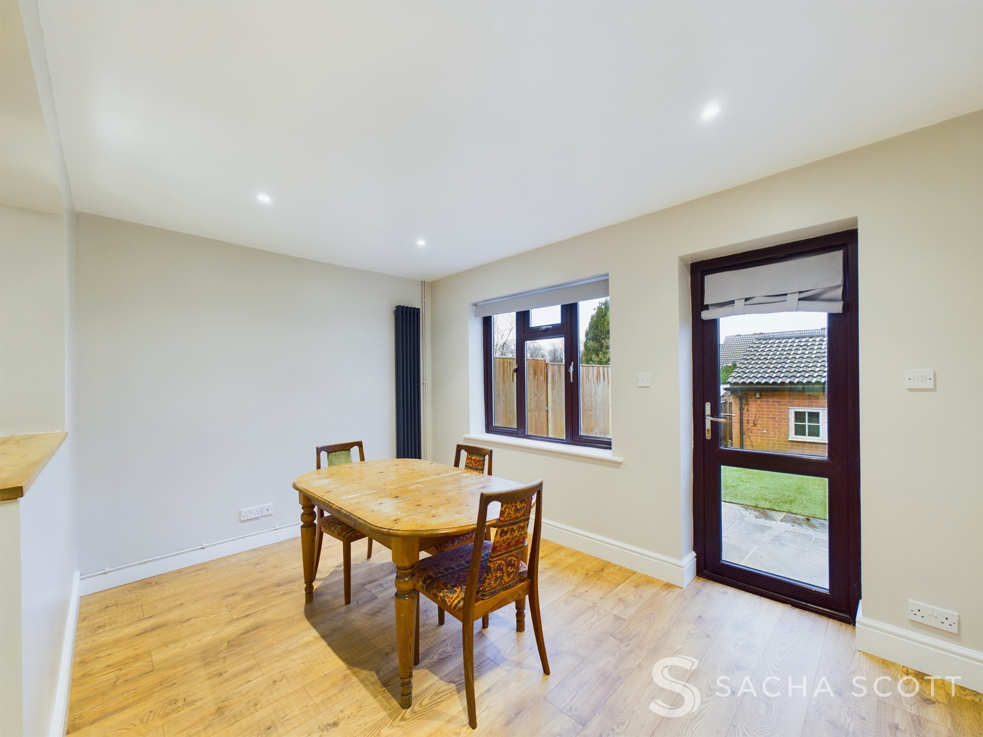 Open plan to the kitchen, the dining area is neutrally painted and benefits from warm wooden flooring and views over the private rear garden.