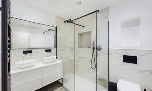 Beautifully presented, the family bathroom offers modern tiling, a large shower enclosure, WC, a twin sink vanity unit with 4 drawers and a heated towel rail.