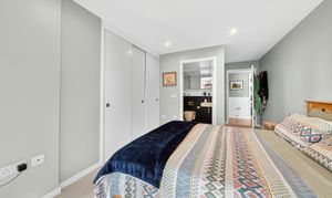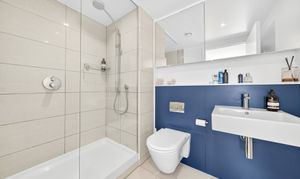 Both double bedrooms are generously sized, with the principal bedroom benefitting from built-in wardrobes with sliding doors for ample storage. It also enjoys a private en-suite bathroom, while the second bathroom offers a modern walk-in shower and a contemporary bath. Both are finished to a high standard with elegant sink designs and chic accent walls.