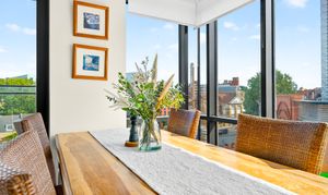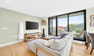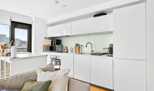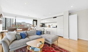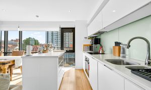 Presenting a beautifully appointed two-bedroom, two-bathroom flat, this modern home is designed for contemporary city living. The property boasts a bright and spacious open-plan living area, enhanced by floor-to-ceiling windows that flood the space with natural light and provide seamless access to a private balcony with stunning city views. The sleek kitchen features integrated appliances, a central island for both dining and meal preparation, and stylish white cabinetry, making it a focal point for entertaining and daily living. Elegant hardwood flooring runs throughout the main living spaces, adding warmth and sophistication.
