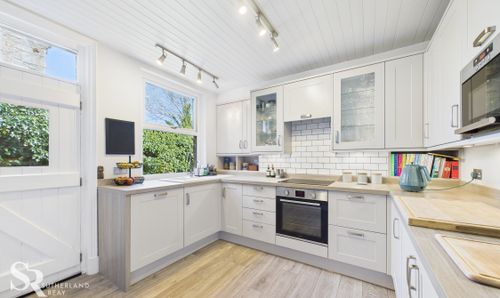 A modern and contemporary kitchen benefiting from a side aspect uPVC framed window and a timber door with a port window, and a transom window above, allowing for excellent natural light. Fitted with a range of wall and base units providing ample storage. Integrated appliances include a dishwasher, under-counter fridge and freezer, an under-counter oven, and a sleek glass stovetop. A timber door leads to a pantry area with stairs descending to the cellar.