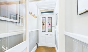 A welcoming room with a front aspect, featuring a timber door with ornate decorative glass windows and floor mat flooring. A further timber door with a clear glass panel leads to the entrance hall. The walls are finished with an embossed wallcovering that beautifully enhances the period features of this charming property.