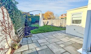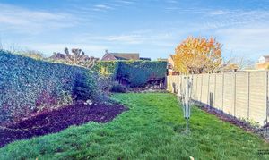 The rear garden features an extensive patio that wraps around the conservatory and extends into the garden, providing plenty of space for outdoor dining and relaxation. Beyond this, a well-kept lawn is complemented by established flower beds, while a mix of hedging and fencing offers privacy and a pleasant, green outlook.