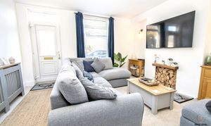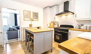 The modern fitted kitchen is a standout feature, offering a central island with solid wood work surfaces, matching base and eye-level units, generous worktop space and a charming Butler-style sink with tiled splashbacks. A range cooker with extractor, built-in dishwasher and space for a fridge/freezer make this a highly functional space for cooking and hosting. A rear-facing double-glazed window brings in natural light, while a radiator ensures year-round comfort. From the kitchen, a rear hall provides access to the ground-floor bathroom, the conservatory and the staircase to the first floor.