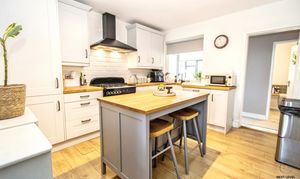 Fitted with matching base and eye-level units, the kitchen offers generous worktop space and a central island topped with solid wood surfaces for food preparation and gathering. A ceramic Butler-style sink sits beneath tiled splashbacks, while a range cooker with extractor hood, built-in dishwasher and space for a fridge/freezer provide everything needed for modern living. A double-glazed window to the rear brings in natural light, and a radiator ensures the space stays warm and welcoming.