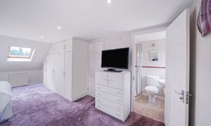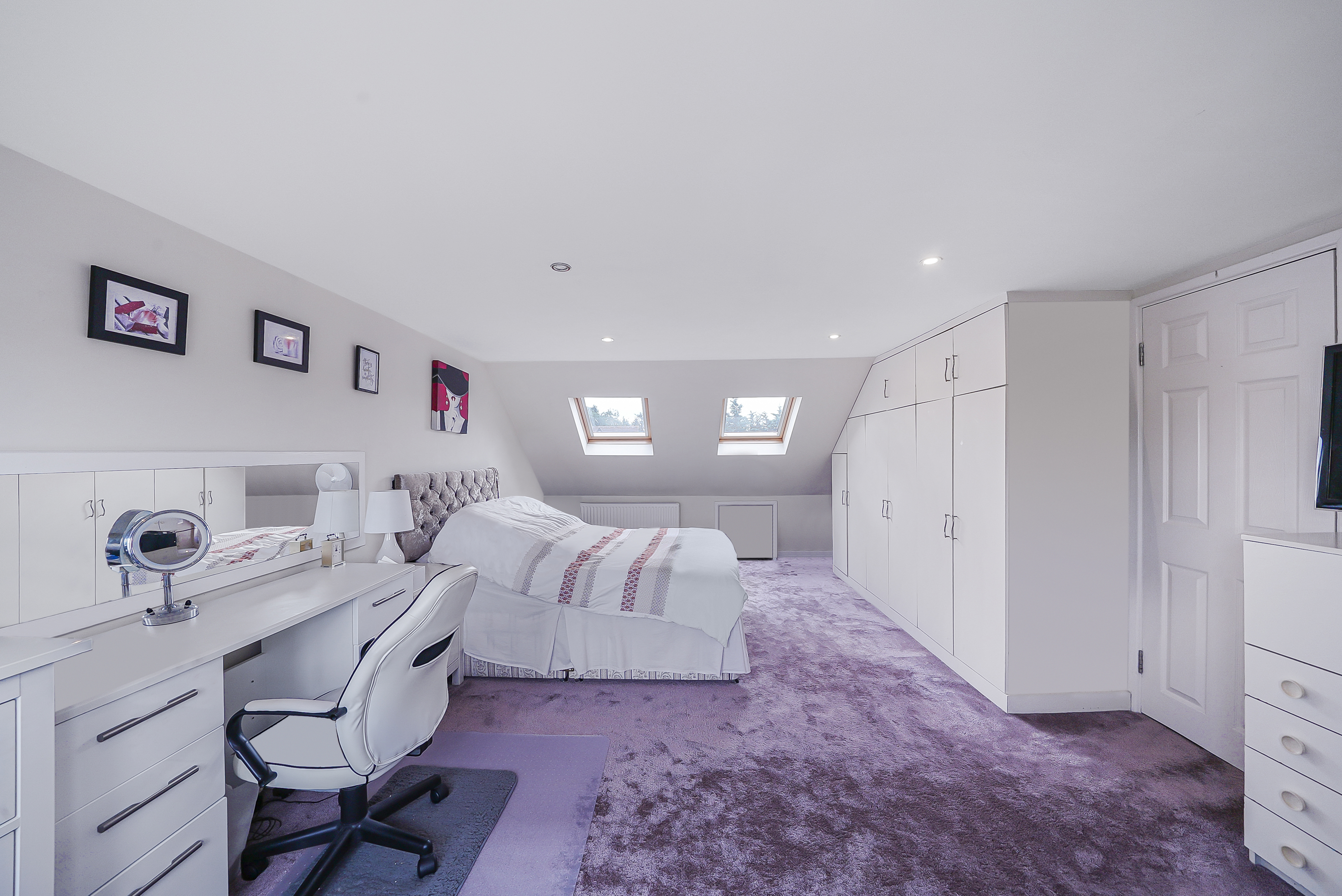A highlight of this home is the magnificent master bedroom loft conversion. This impressive space boasts very generous dimensions and is dual aspect, ensuring superb natural light. It includes custom-fitted wardrobes, two skylights, a modern en-suite shower room with a window, and charming views overlooking the rear garden and beyond. This master suite also benefits from convenient eaves storage and plenty of space for a dedicated dressing area, creating a truly secluded and personal retreat.