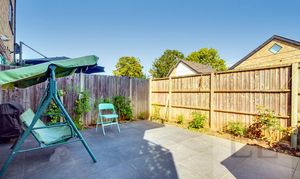 The apartment features a spacious open-plan living area with a modern fitted kitchen complete with an island and top-quality appliances – ideal for cooking enthusiasts. The living space flows seamlessly onto a front balcony with a glass front, while the rear private patio, complete with Grange fencing and a storage shed, provides a perfect space for outdoor dining or relaxation. The patio also includes external sockets and a tap for added convenience.