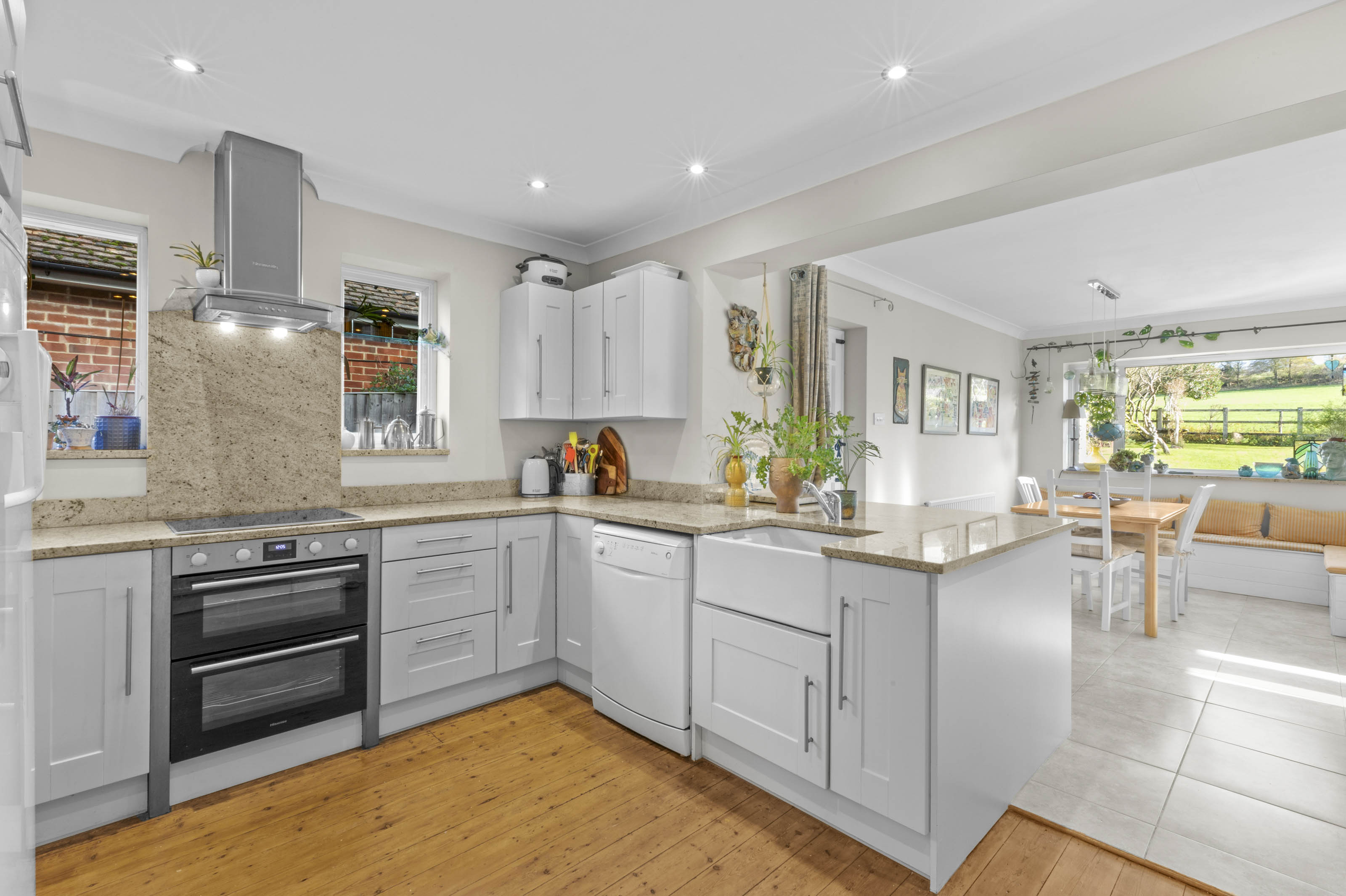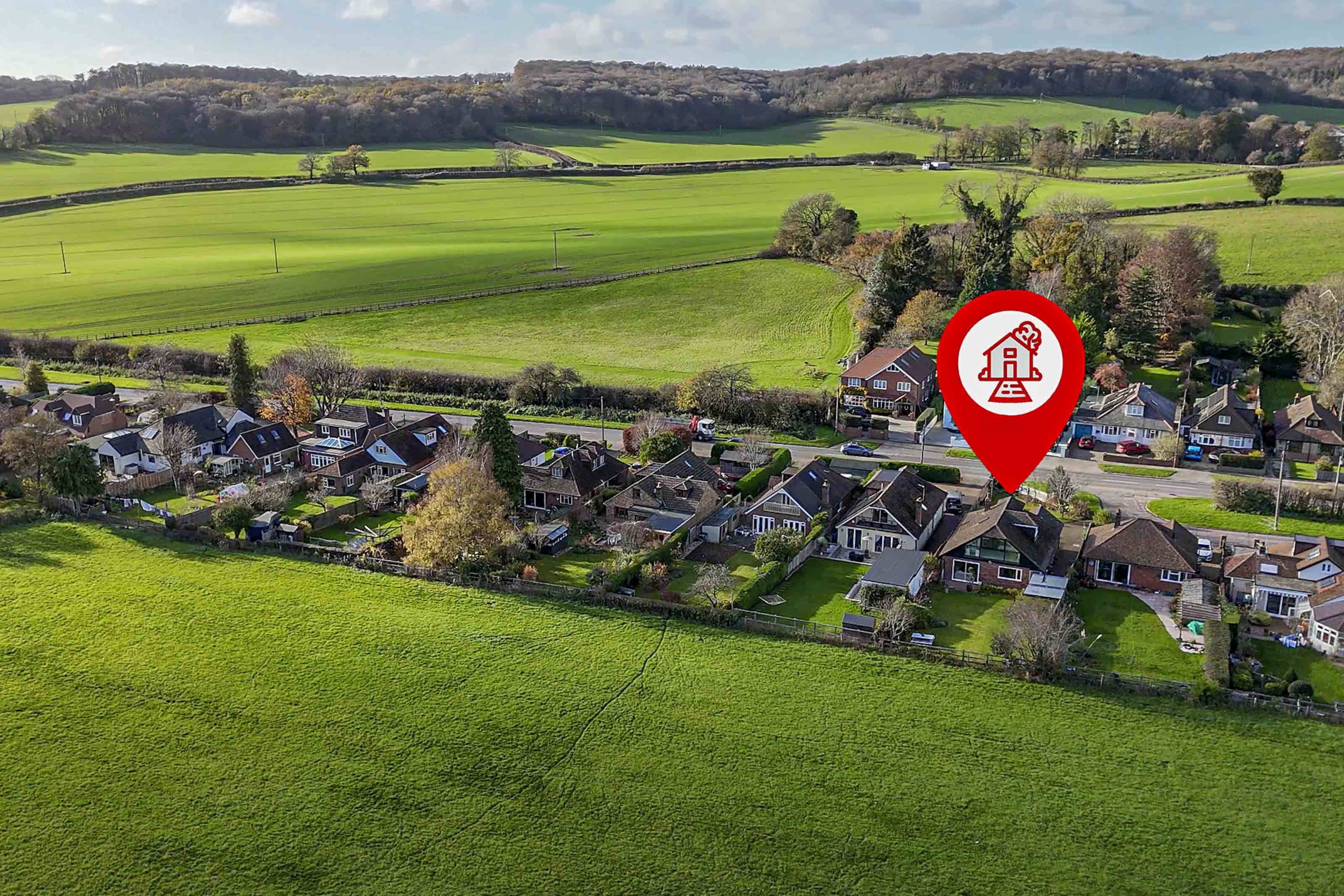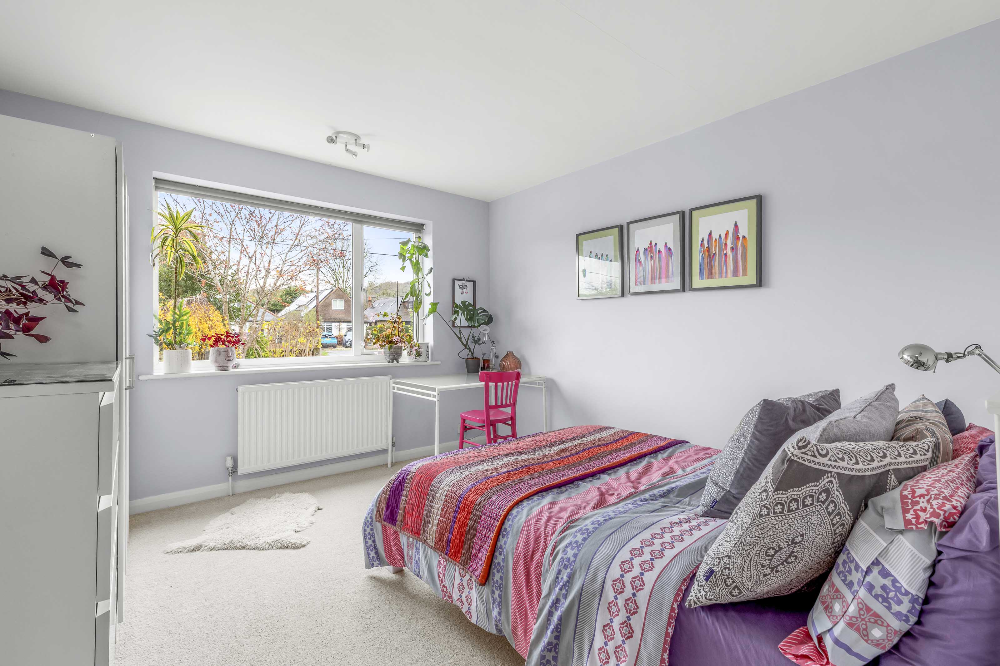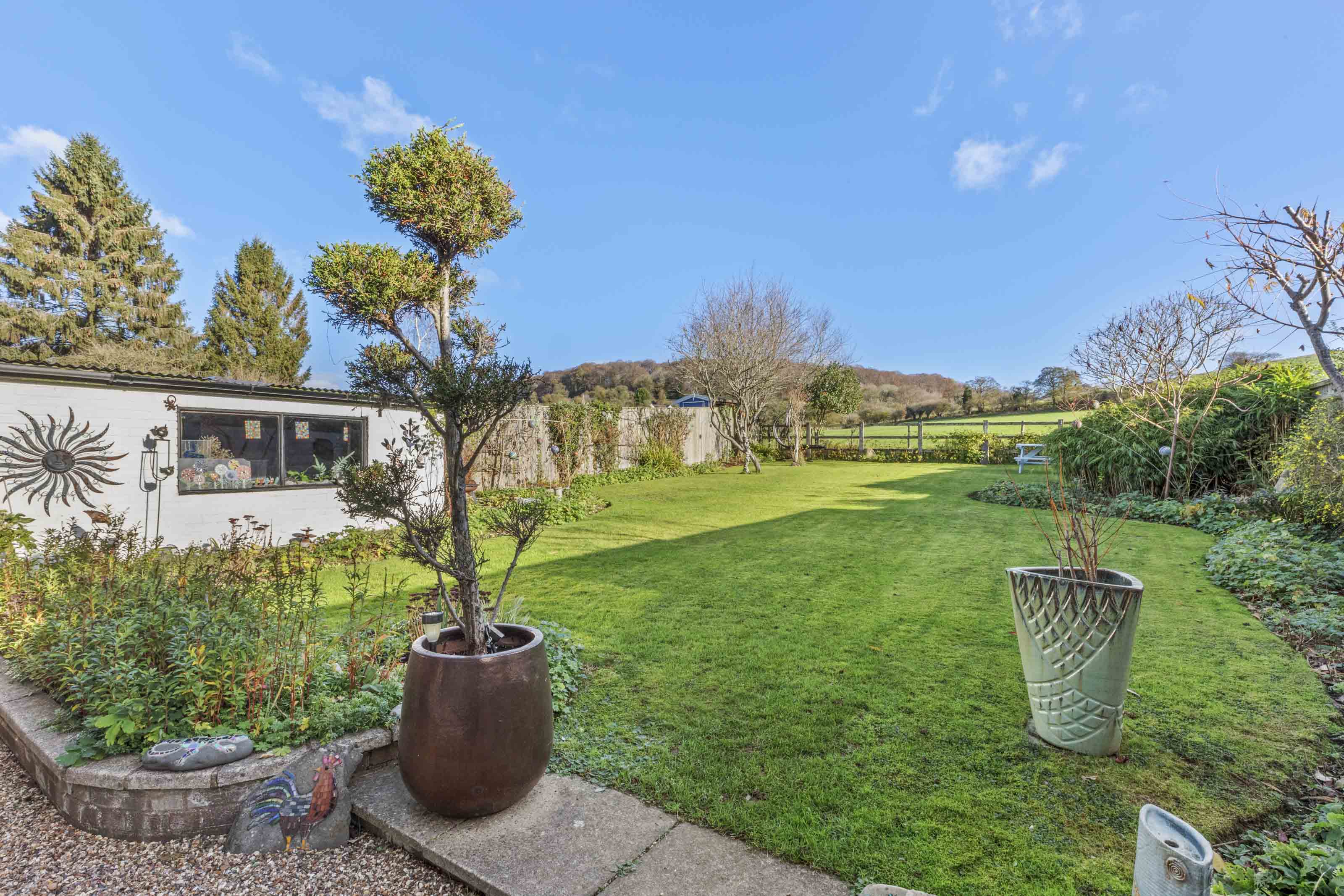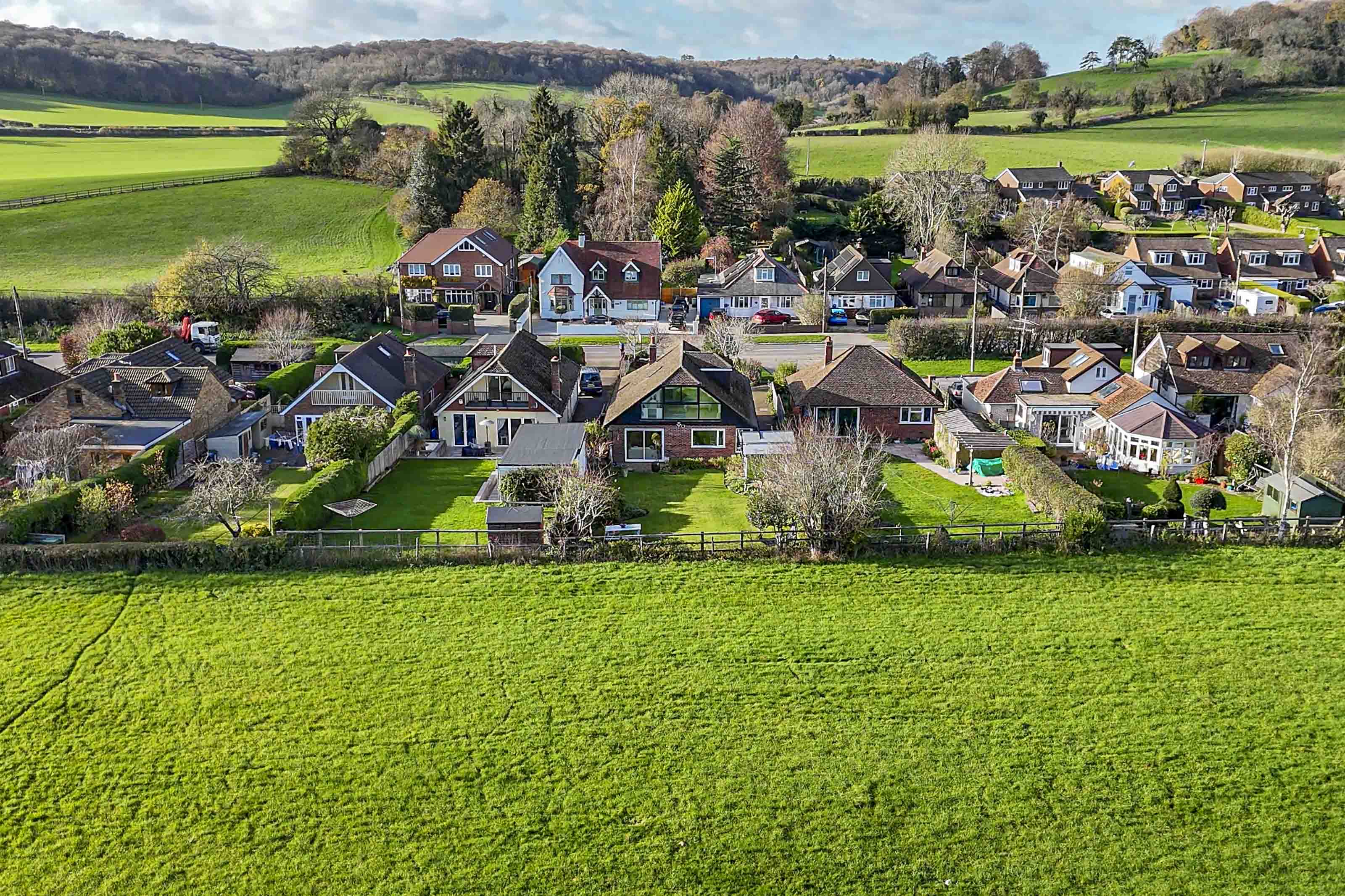 Outside, an extensive driveway ushers you towards a detached garage, offering ample parking space. The rear garden boasts a patio area leading to a spacious lawn bordered by vibrant flower beds providing bursts of colour throughout the seasons. This peaceful oasis is further enhanced by uninterrupted views of the open countryside from the hill behind and many wonderful walks over the surrounding hills and through the local beech woods.