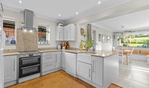 The heart of this home resides in the stylish kitchen, which has been meticulously updated to include a range of base and eye level units and Indian granite, Madura gold worktops, splashbacks and window sills. This culinary space seamlessly connects to a generous breakfast/dining area and a door leading to a charming winter garden. The generous sitting room, features patio doors that open up to the garden with views beyond.