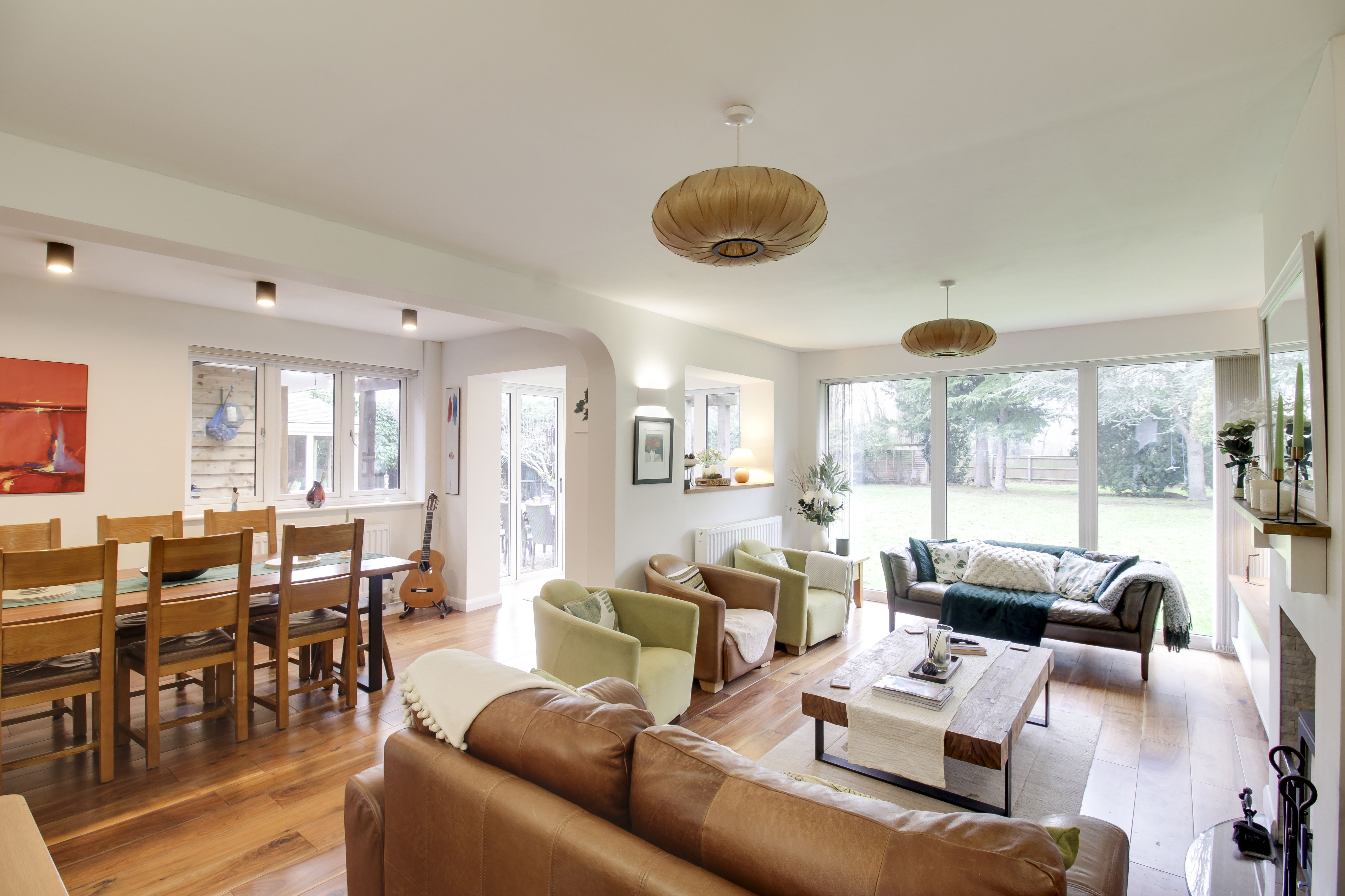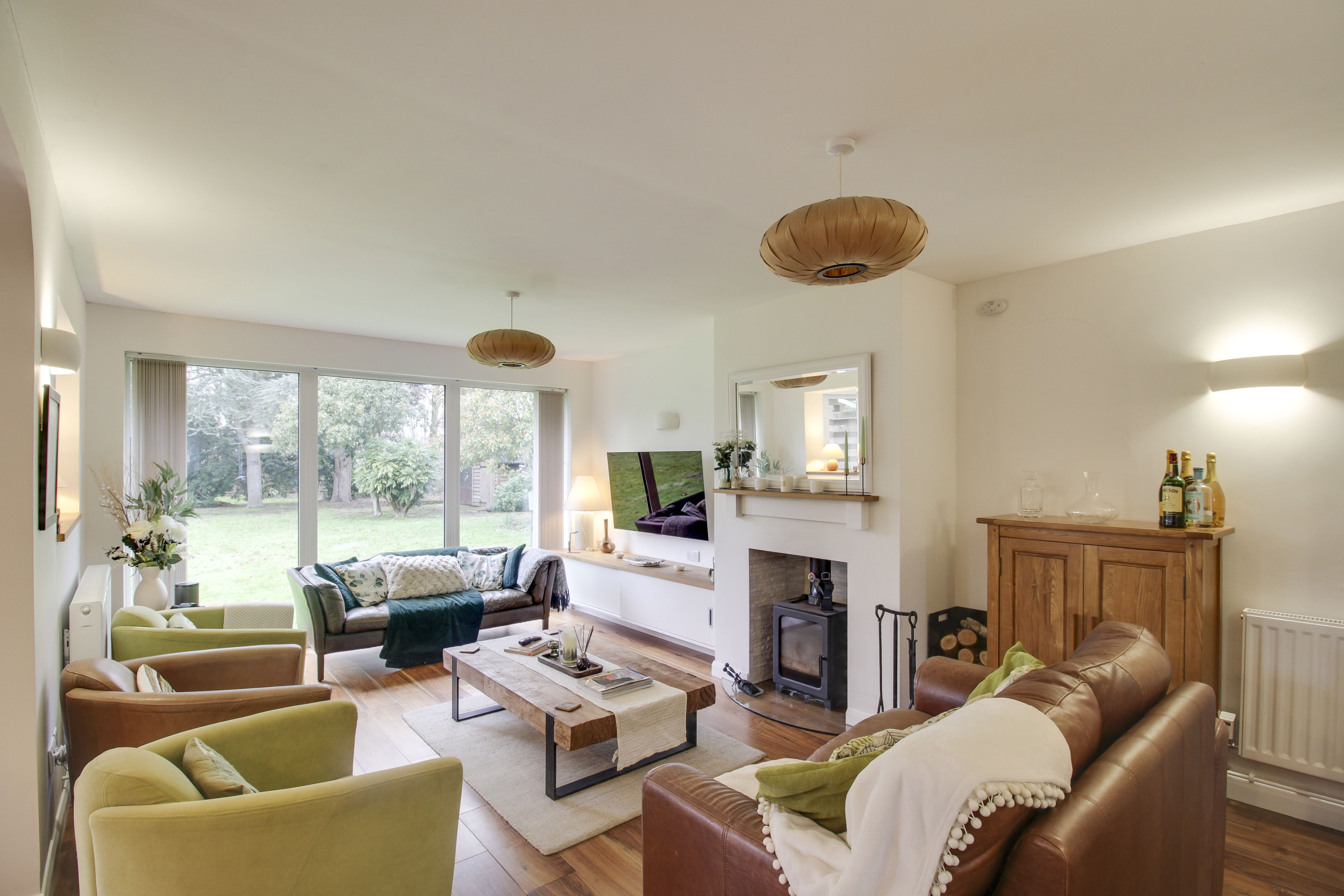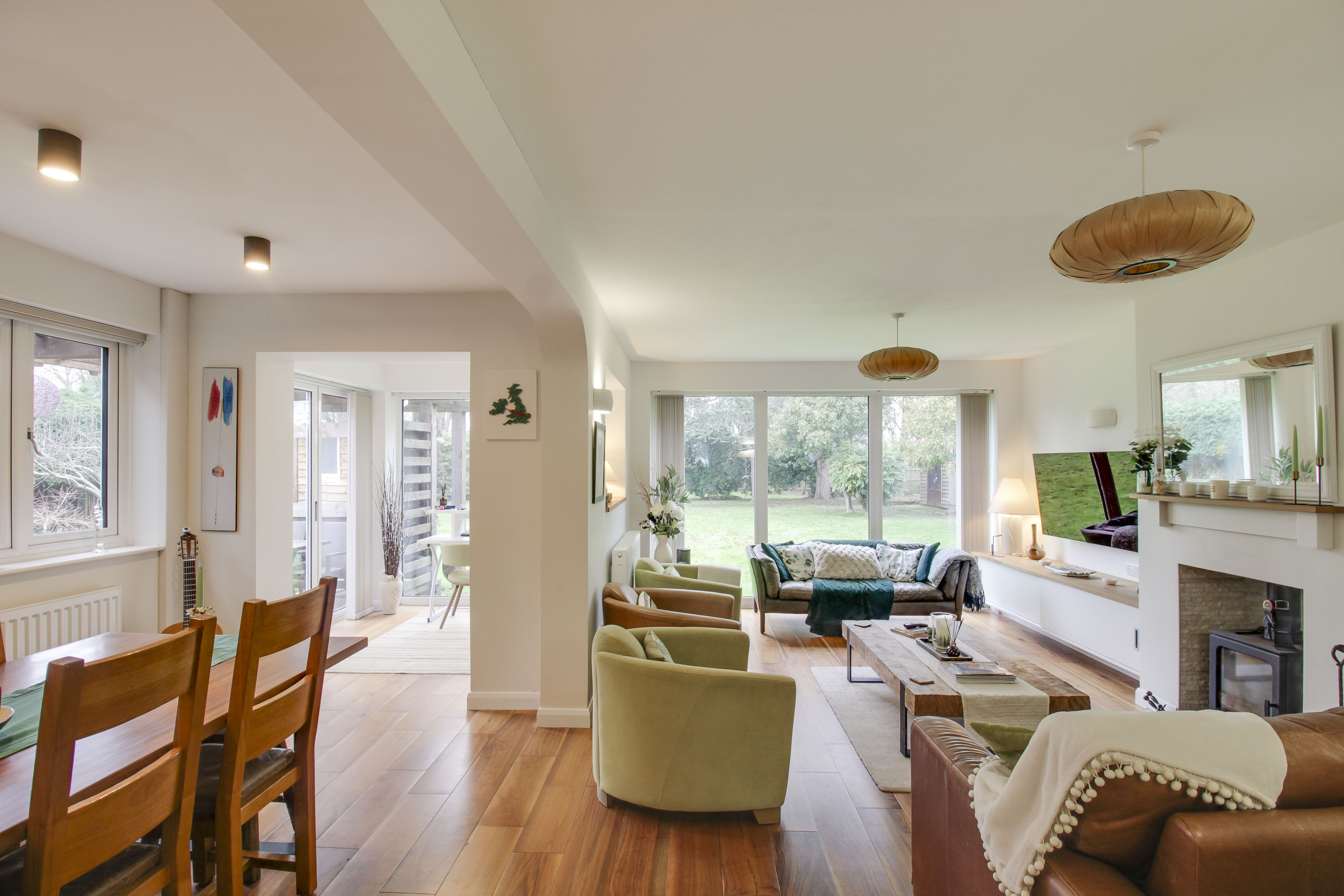 Full width and height UPVC Triple glazed windows overlooking rear garden. Wood flooring. Feature log burning stove with brick surround and glass hearth. TV point. Two radiators. Wall lights. Open plan through to dining room.
