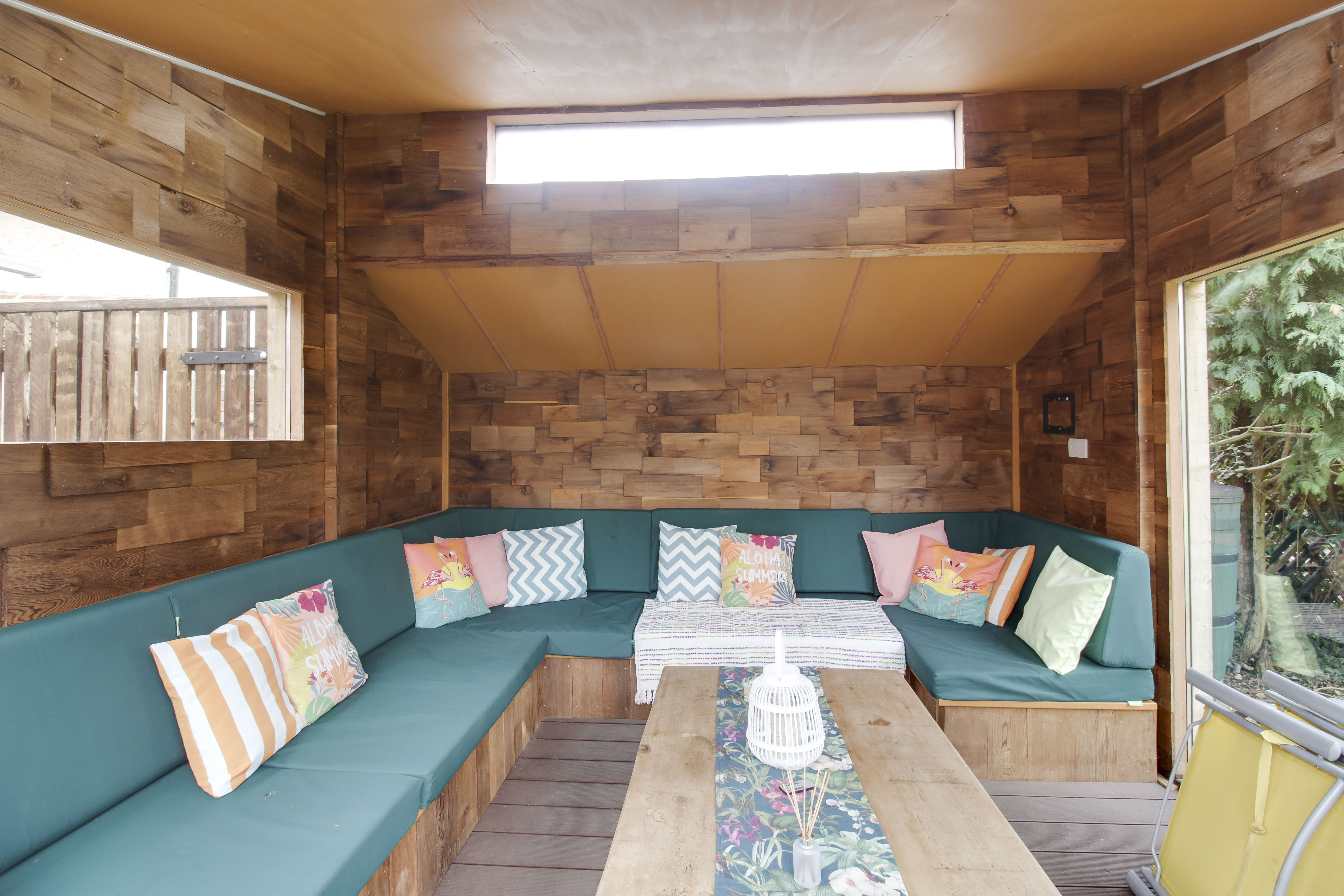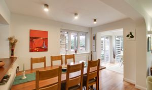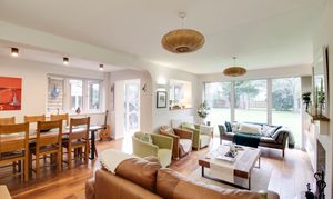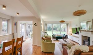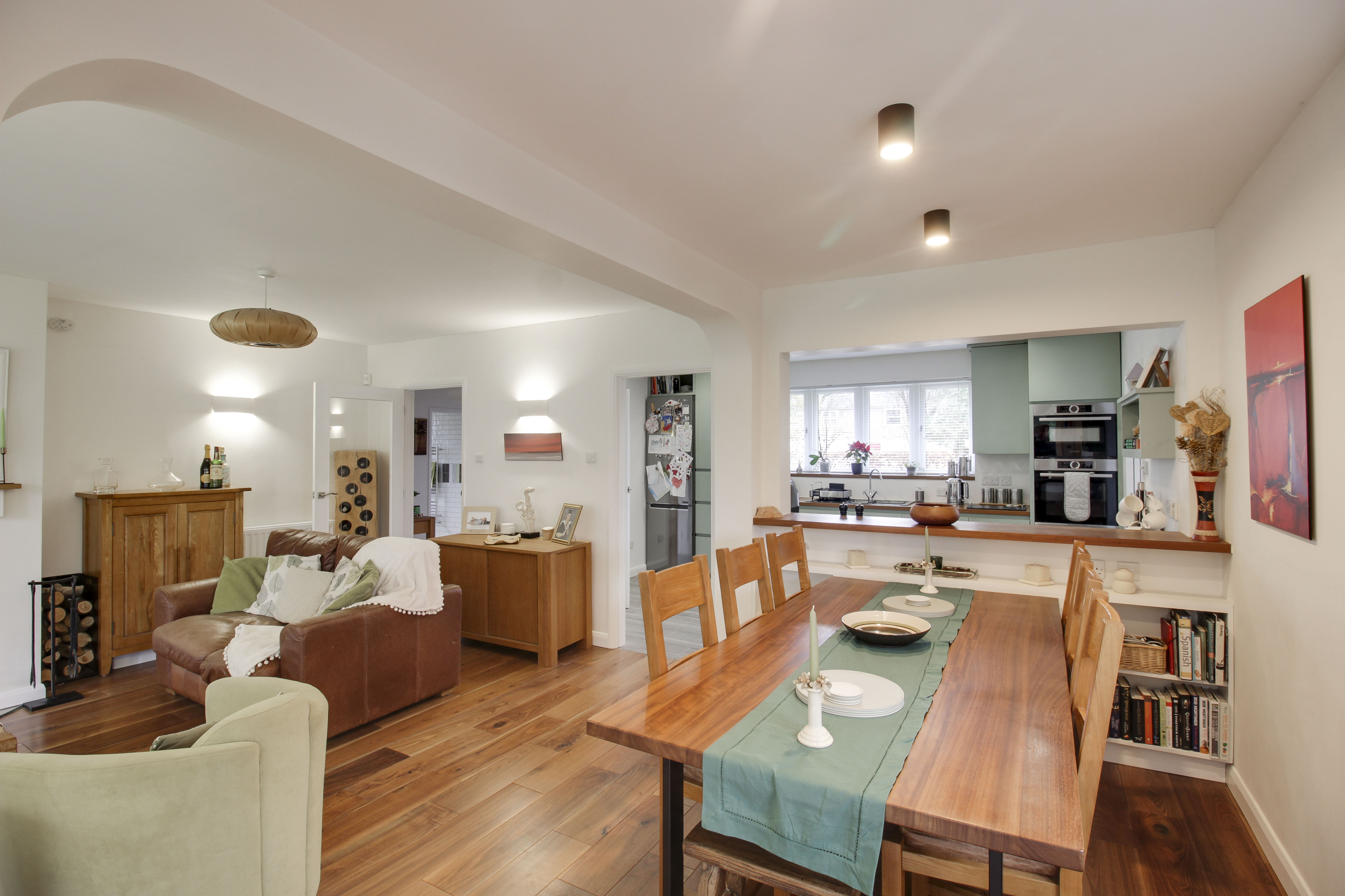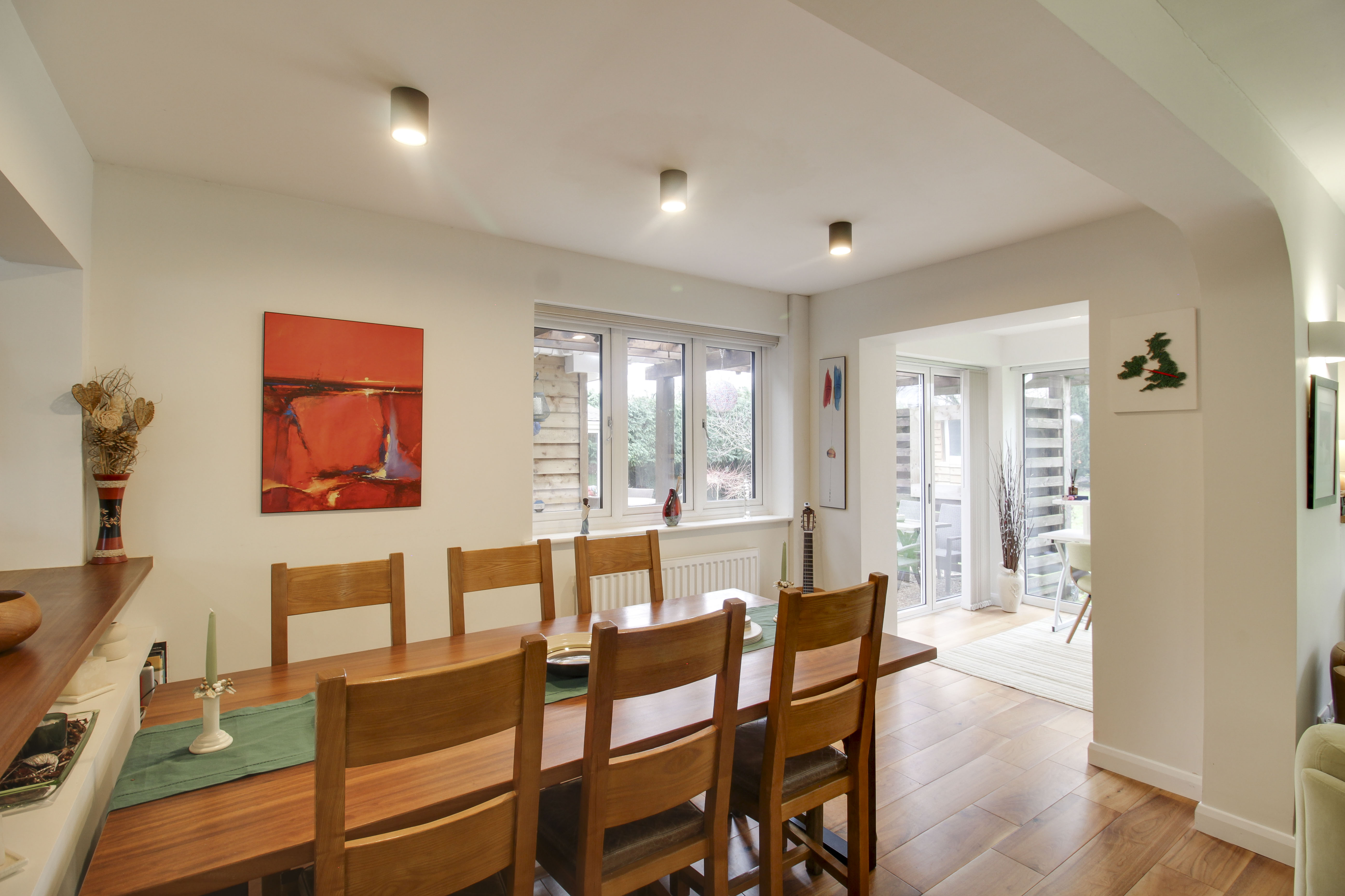 Full width and height UPVC Triple glazed windows overlooking rear garden. Wood flooring. Feature log burning stove with brick surround and glass hearth. TV point. Two radiators. Wall lights. Open plan through to dining room.