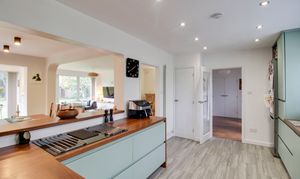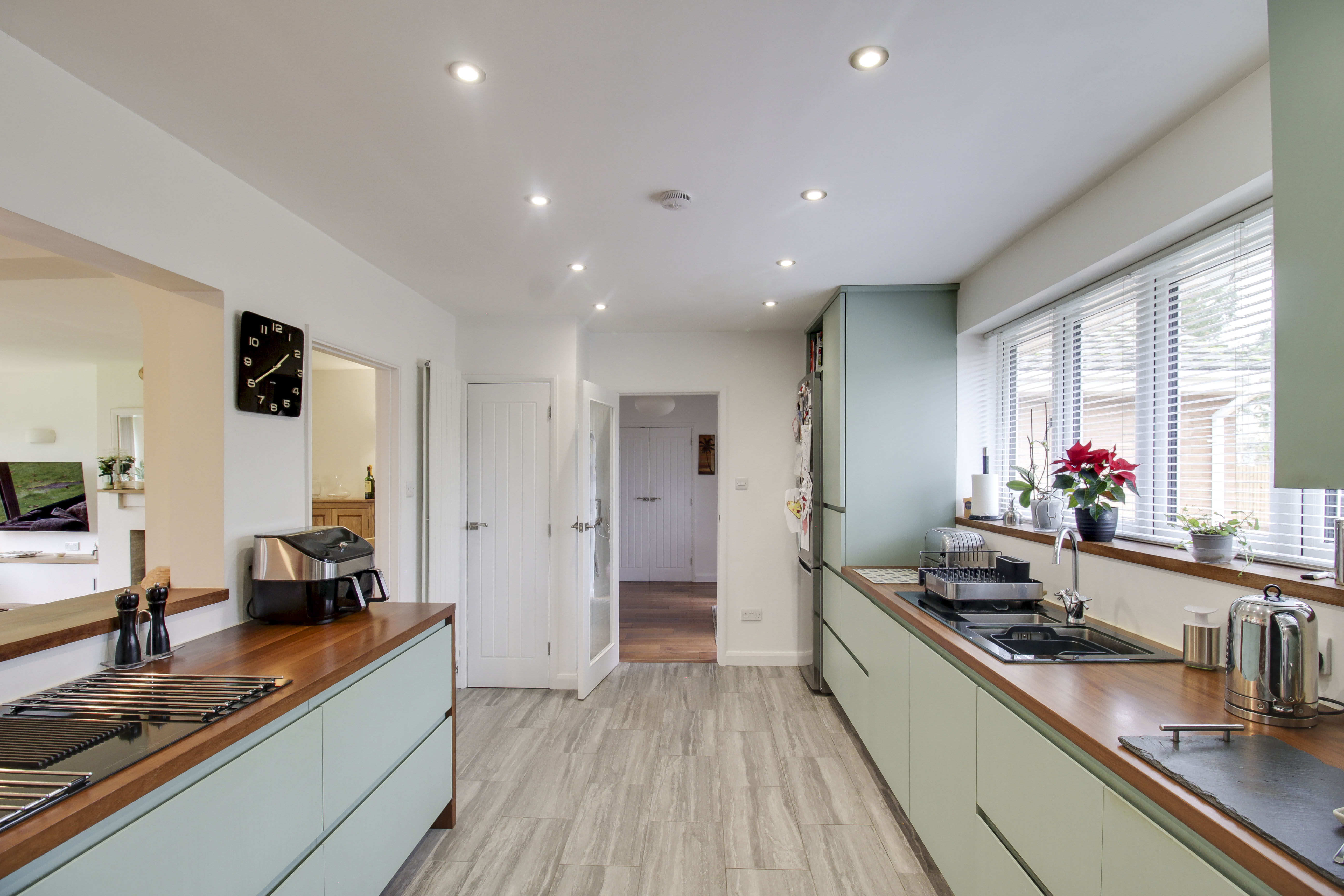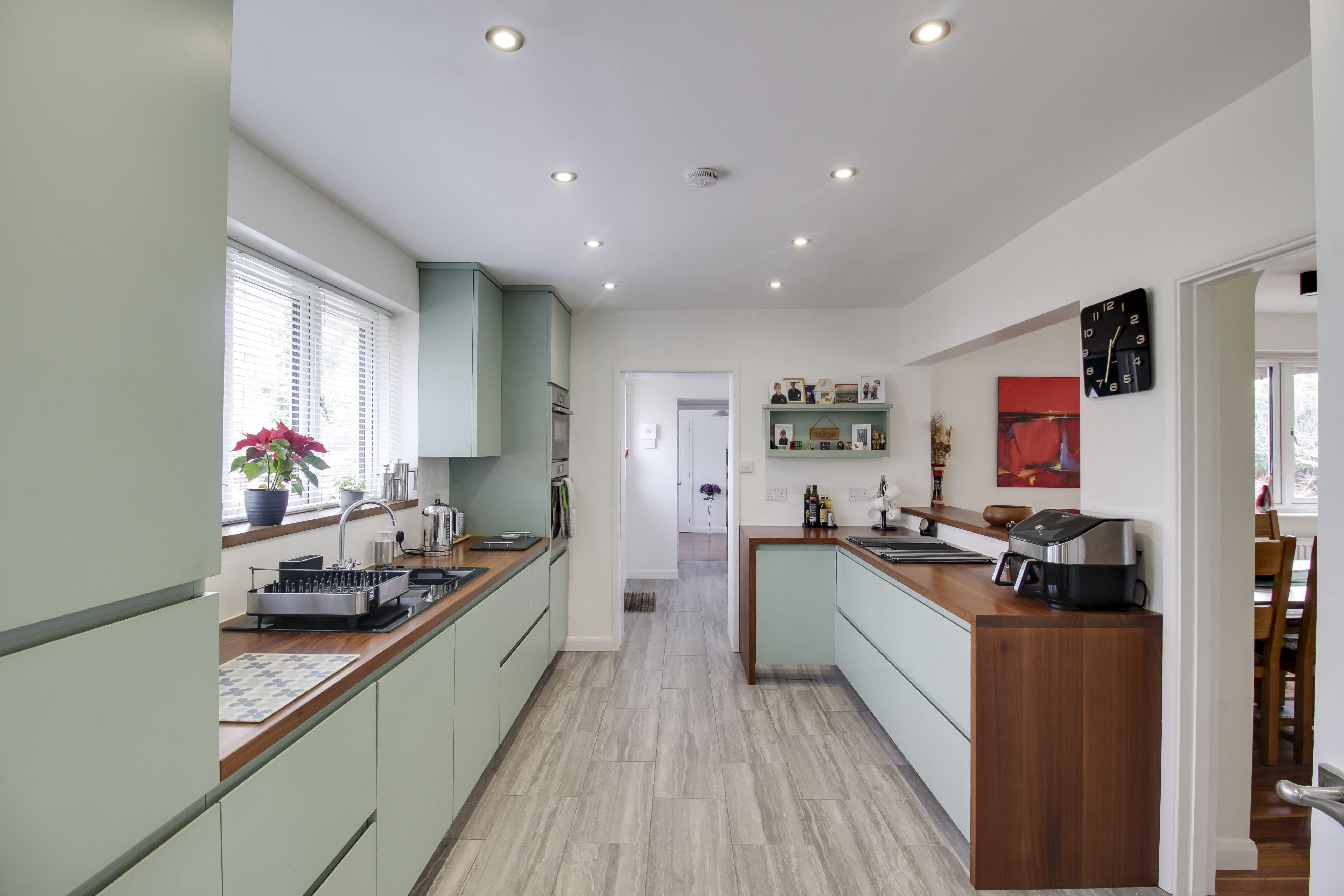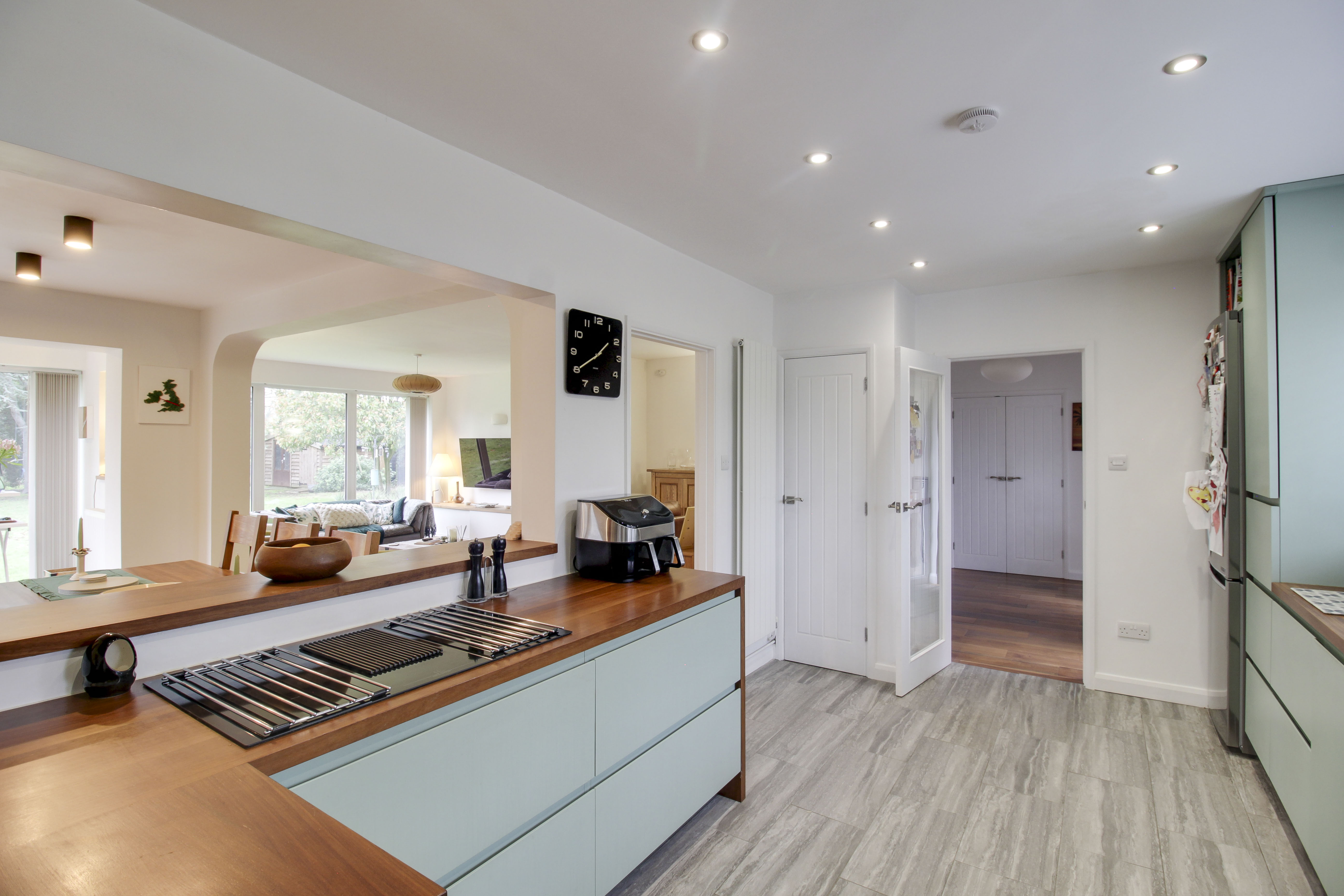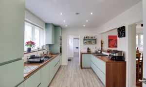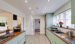 Refitted kitchen comprising solid wood worksurfaces with drawers and cupboards under. Wall mounted cupboards. One and a half bowl sink with mixer tap. Built in double oven and induction hob. Storage cupboard. Inset ceiling lights. Tall radiator. UPVC Triple glazed window to front. Doorway to living room and utility room.