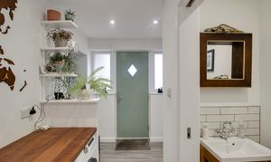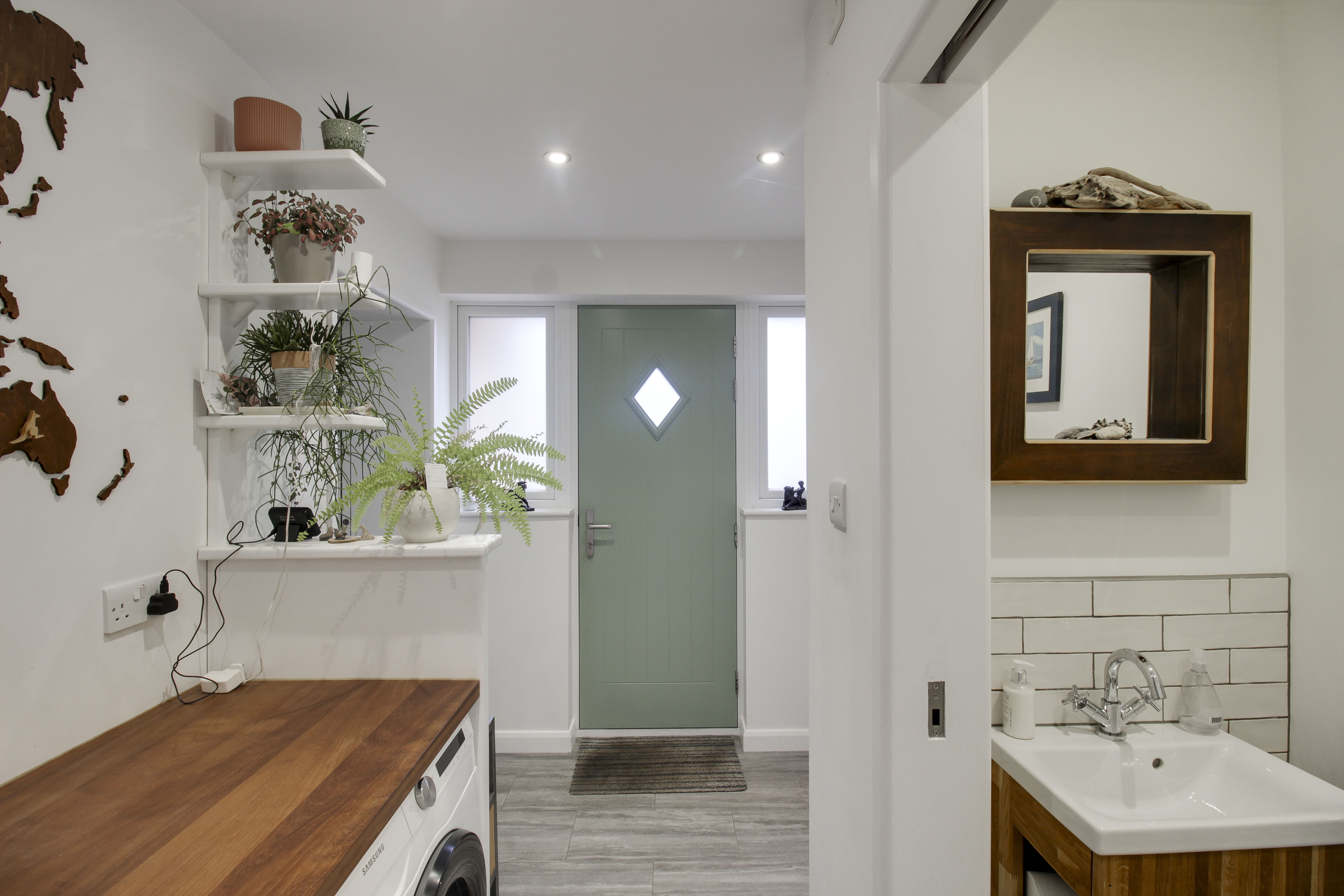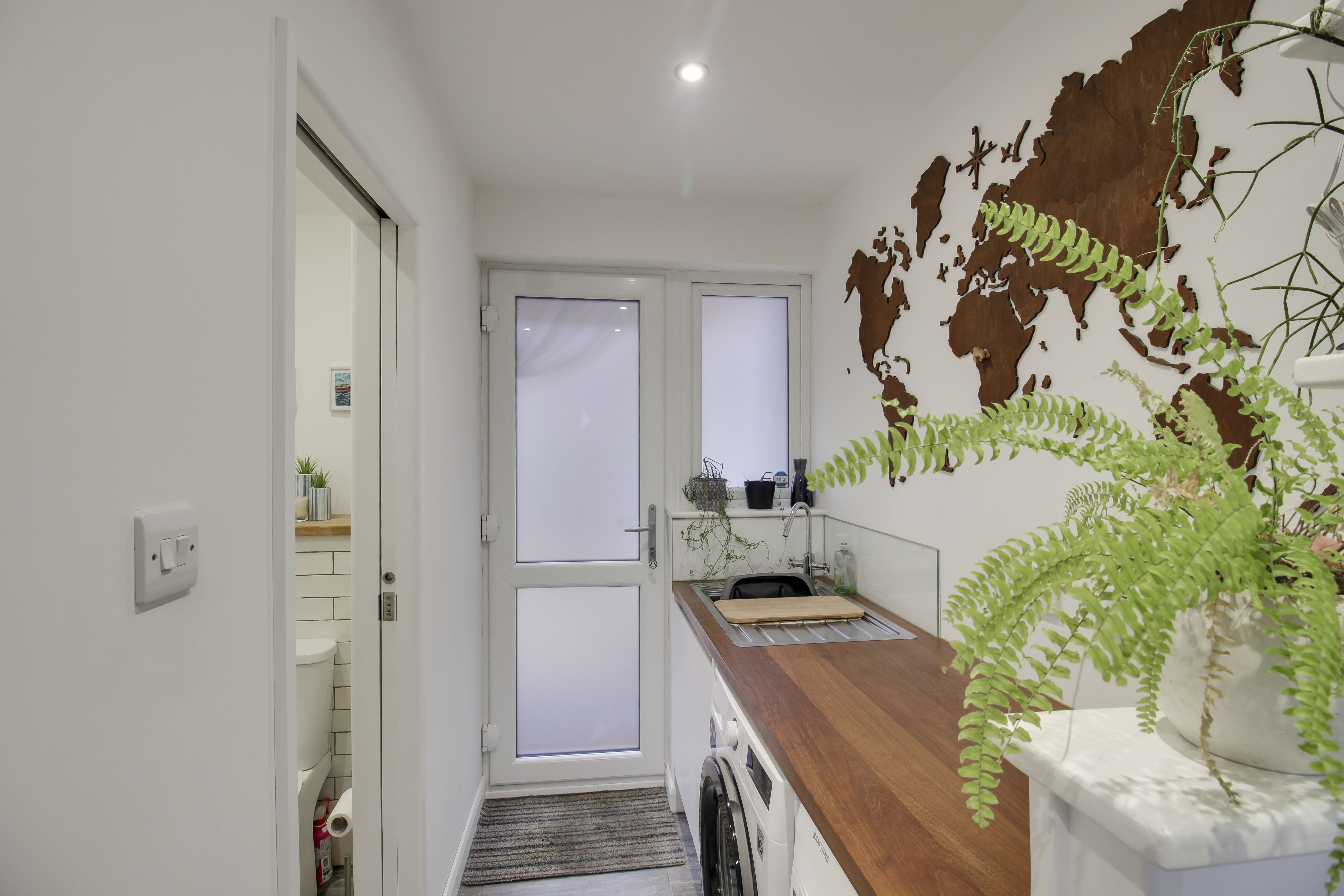Wood worksurface with cupboards under. Single bowl sink with mixer tap and glass splash backs. Plumbing for washing machine. UPVC window and door to rear garden. Composite door to front. Storage cupboard. Doors to WC and bedroom one. Inset ceiling lights.