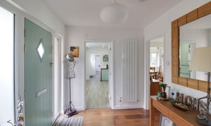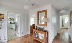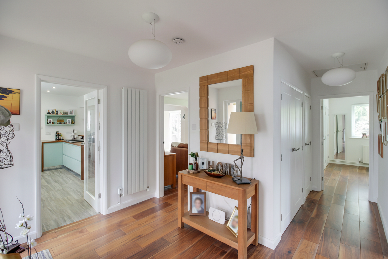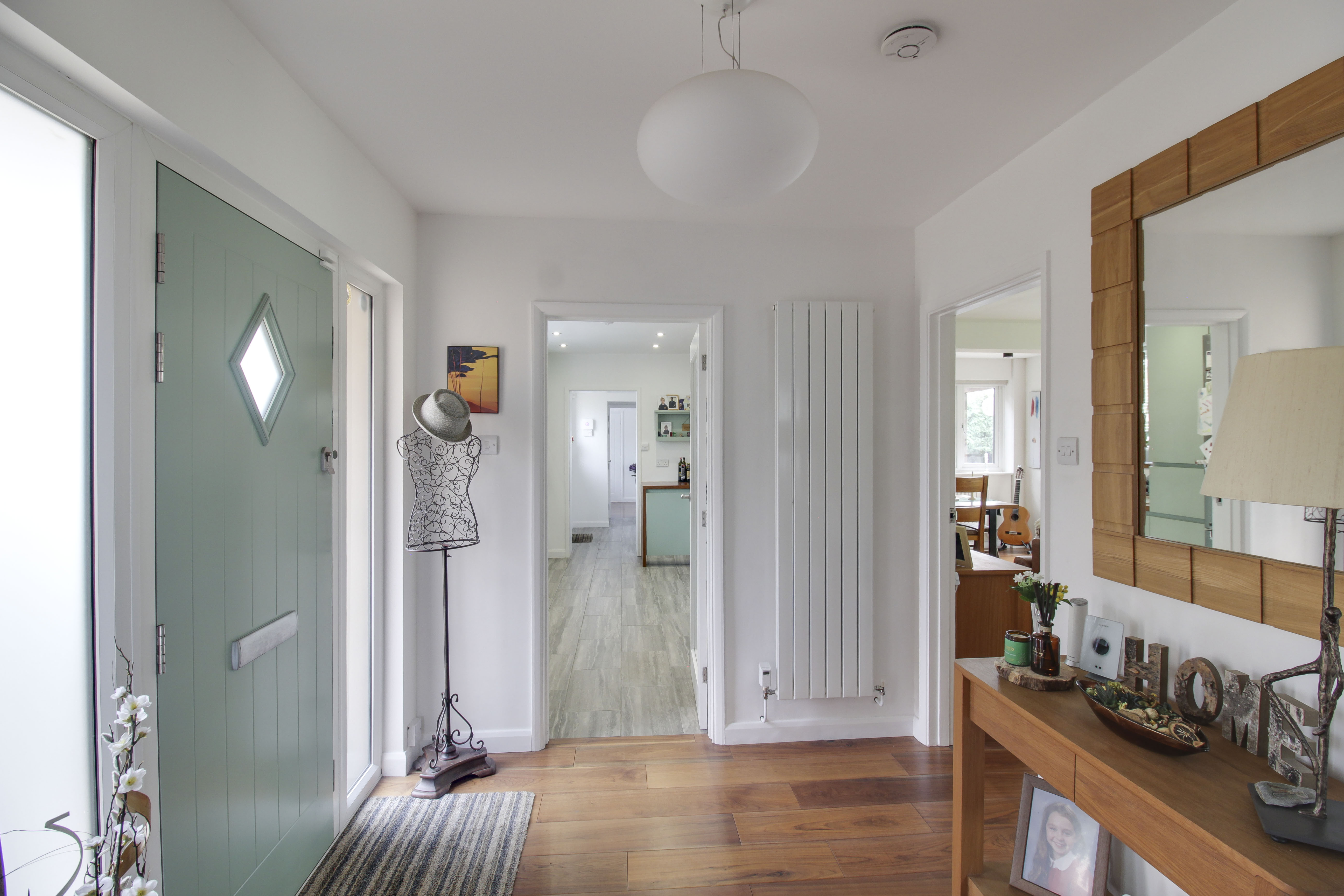 Composite entrance door leading to entrance hall. UPVC windows to front. Wood flooring. Cupboard housing gas boiler and pressurised hot water cylinder. Two additional storage cupboards. Tall radiator. Loft access. Doors to living room, kitchen, bedrooms two, three and four plus family bathroom. Smoke alarm.