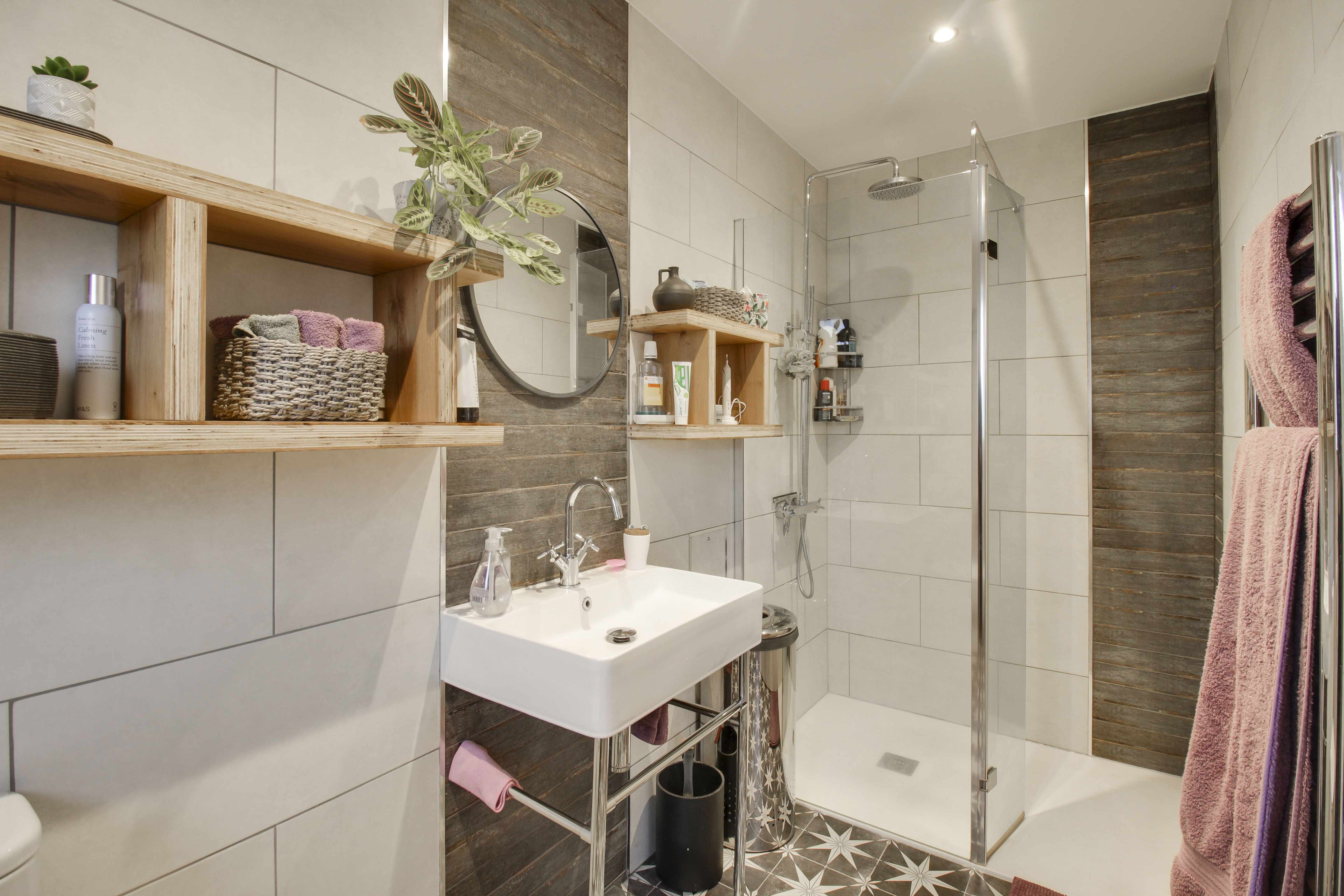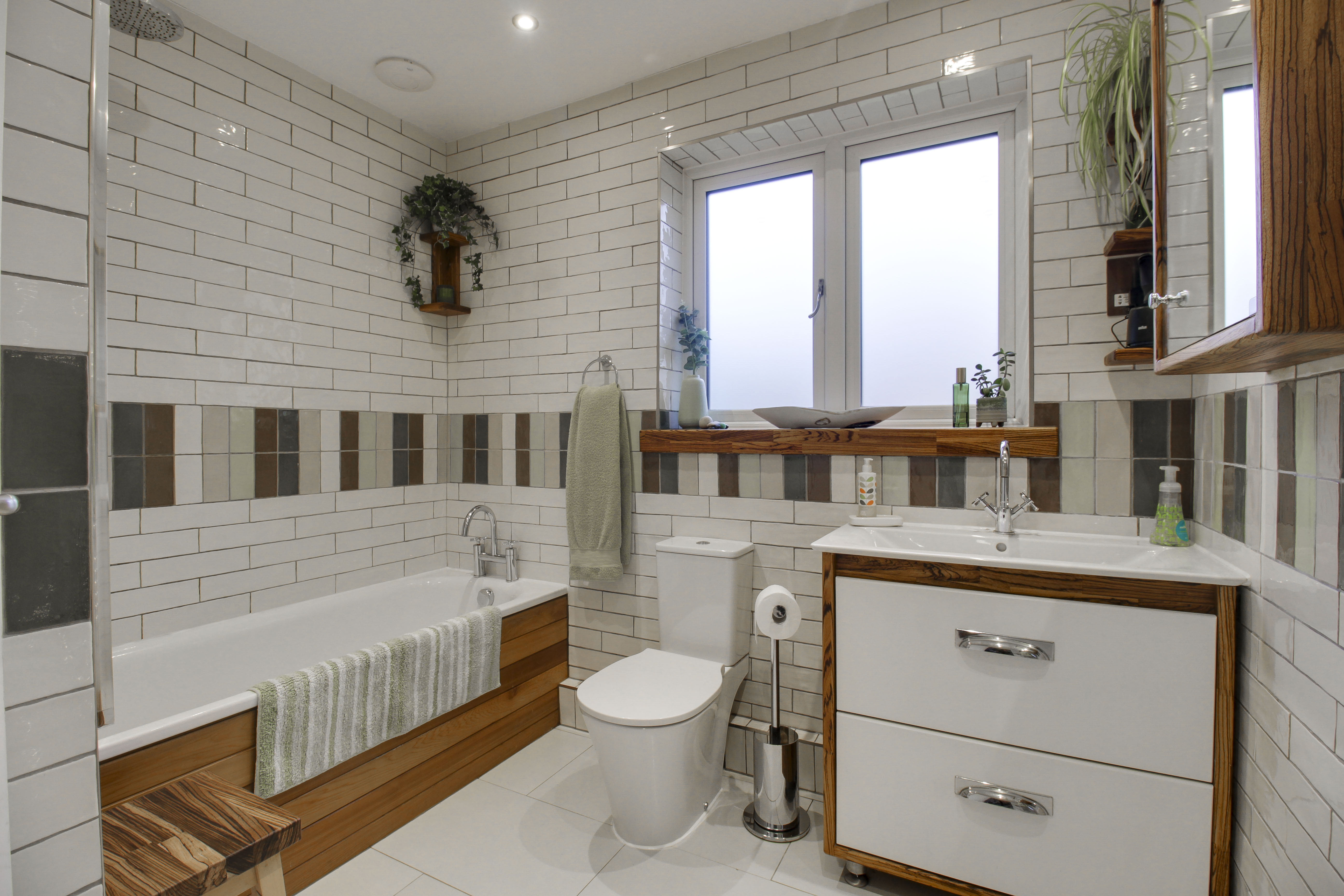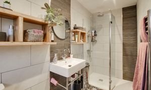 Refitted three piece white suite comprising low level WC, wash hand basin with vanity unit and panelled bath with shower over. Glass screen and tiled splash backs. Tiled floor. Heated towel. UPVC Triple glazed windows to side.