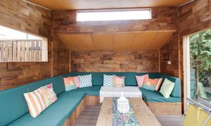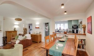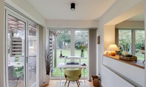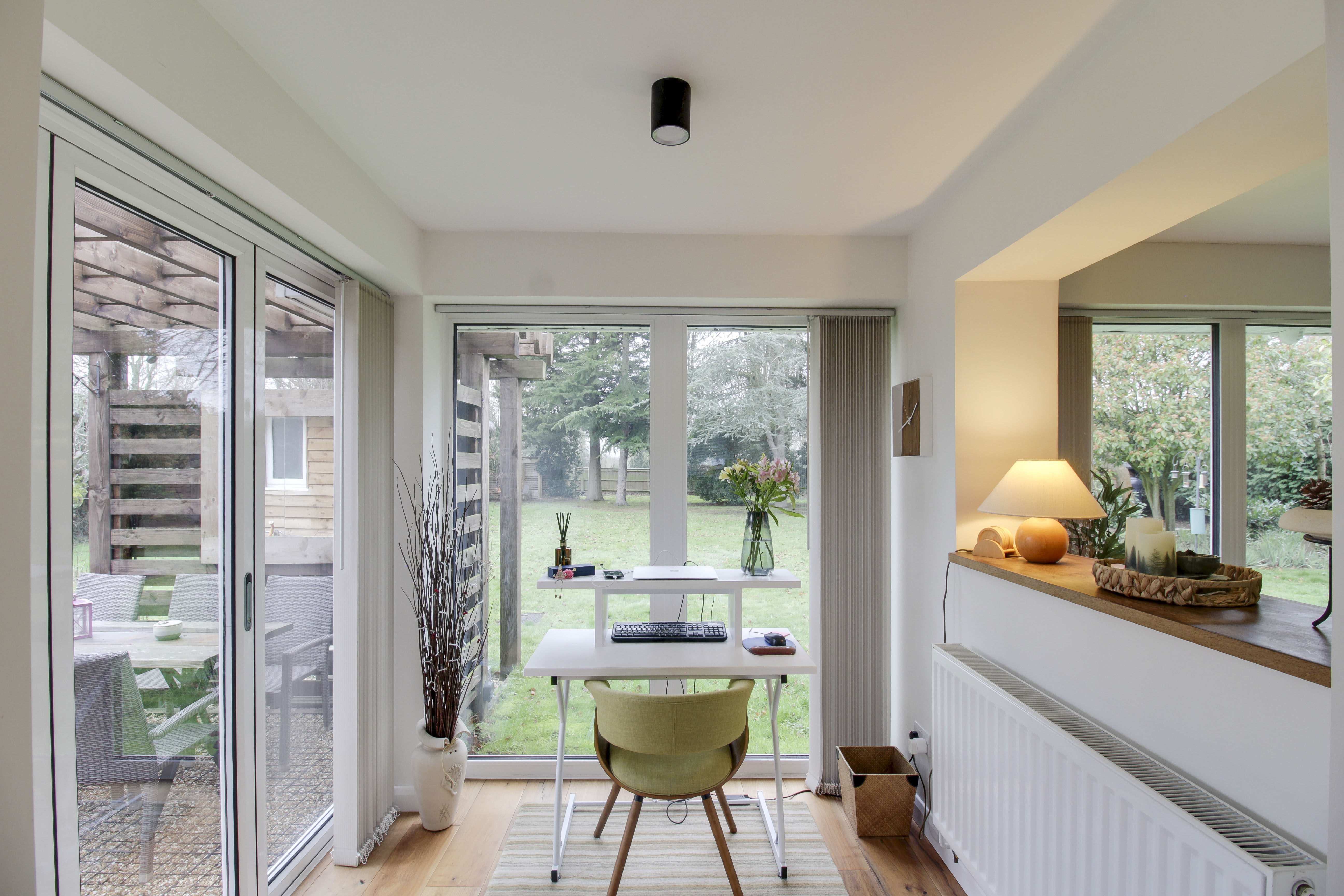 Bi-folding doors to side. Triple glazed full height windows to rear garden. Wood flooring. Radiator.