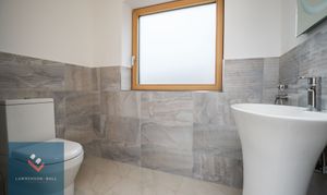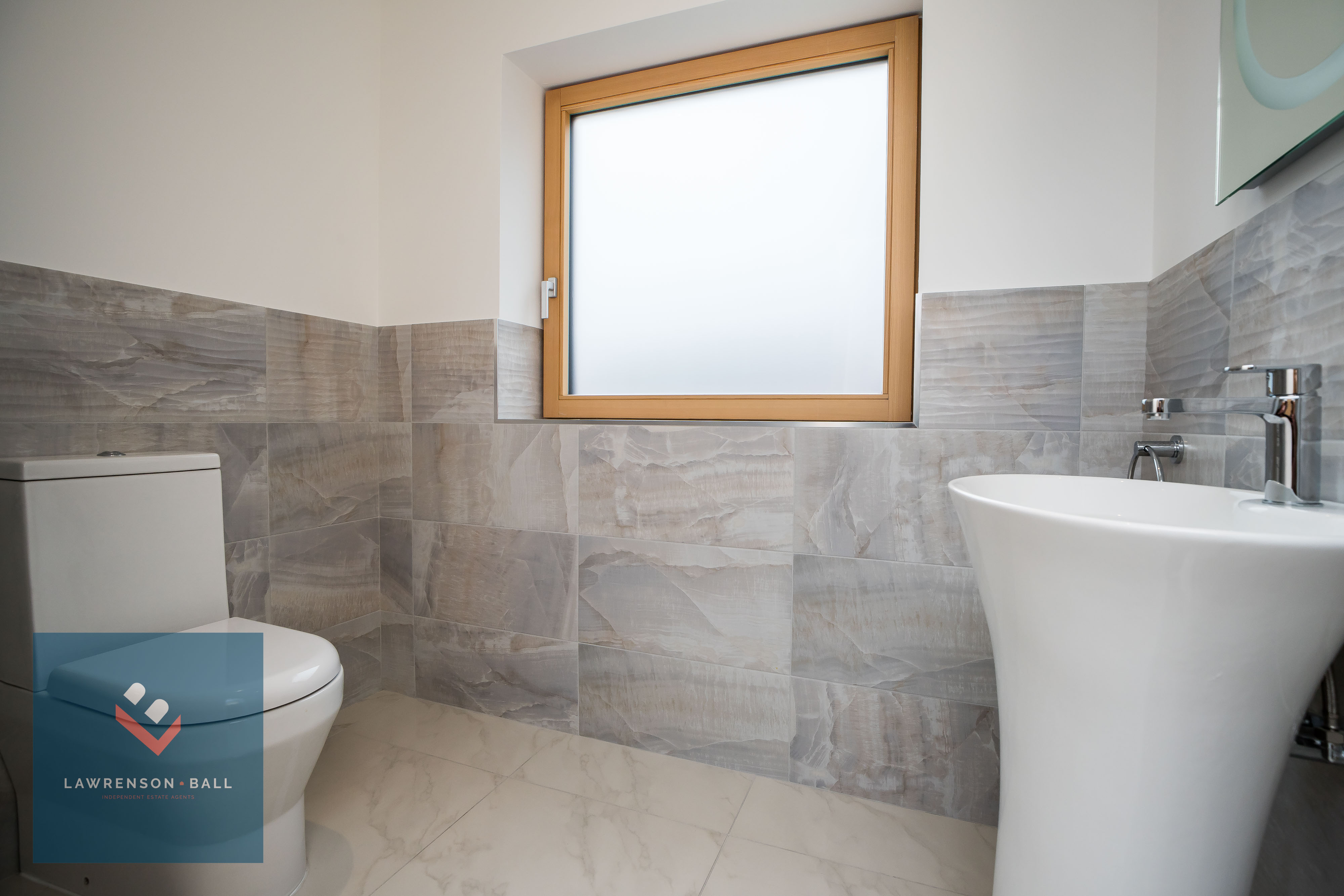 Large room with obscure glazed window, polished porcelain floor tiles and half tiled wall tiles. Feature floor standing washbasin and WC suite. Oak faced internal door.