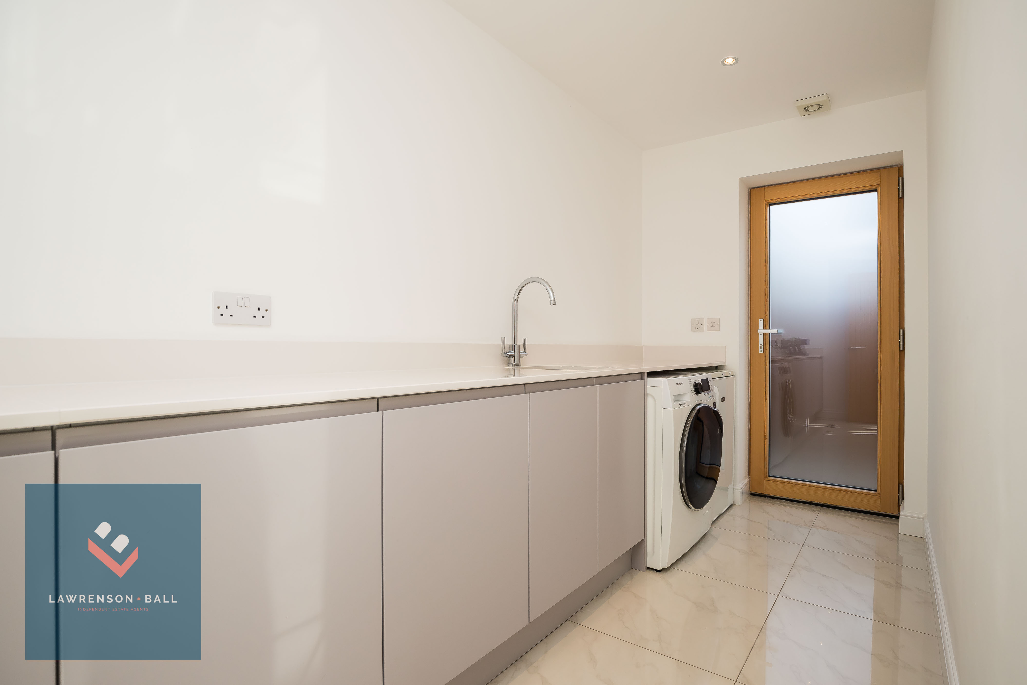 The Utility room includes cabinetry, work surfaces and sinks to match the Kitchen and there is space for a washer/dryer and fridge/freezer. LED downlighters. Floors are polished porcelain tiling.
