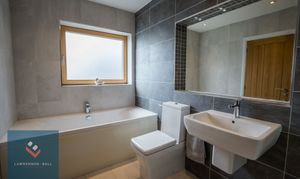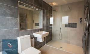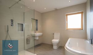 Large bathroom incorporating high quality branded contemporary fittings including double ended bath, low level shower tray with frameless glass screen and rain shower, WC and wash basin and Peglar taps. Walls are tiled full height with recess to shower and recess with mirror above wash basin. Floors are tiled. LED lighting. Heated towel rail. Underfloor heating. Obscure glazed window. Oak faced internal door.