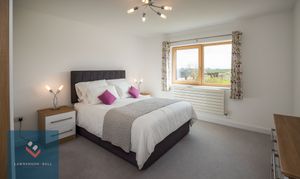 A large principle bedroom with large triple glazed window overlooking the rear garden and beyond to the surrounding countryside. Built in wardrobes. Contemporary central heating radiator. Oak faced internal door.