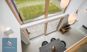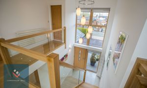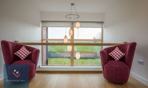 The first floor landing is very spacious and incorporates a galleried seating area looking down over the downstairs Dining Area and also offering outstanding views outside through the rear glazed screen. LED downlighters. Flooring is engineered oak. Two designer radiators. There is also an airing cupboard with slatted shelving and a radiator.