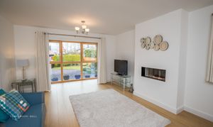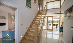 The entrance to the property is a real wow factor with a two storey, triple glazed aluminium entrance screen and entrance door leading into the light filled large hallway. The hallway is further enhanced by a bespoke open tread oak staircase with glazed balustrading. The flooring is polished porcelain tiling which extends throughout the ground floor (except for the Living Room).