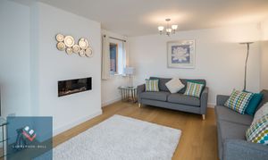 A light filled front reception room with feature square bay window and further side window. Oak faced internal door. Engineered Oak flooring. Feature hole in the wall living flame gas fire.