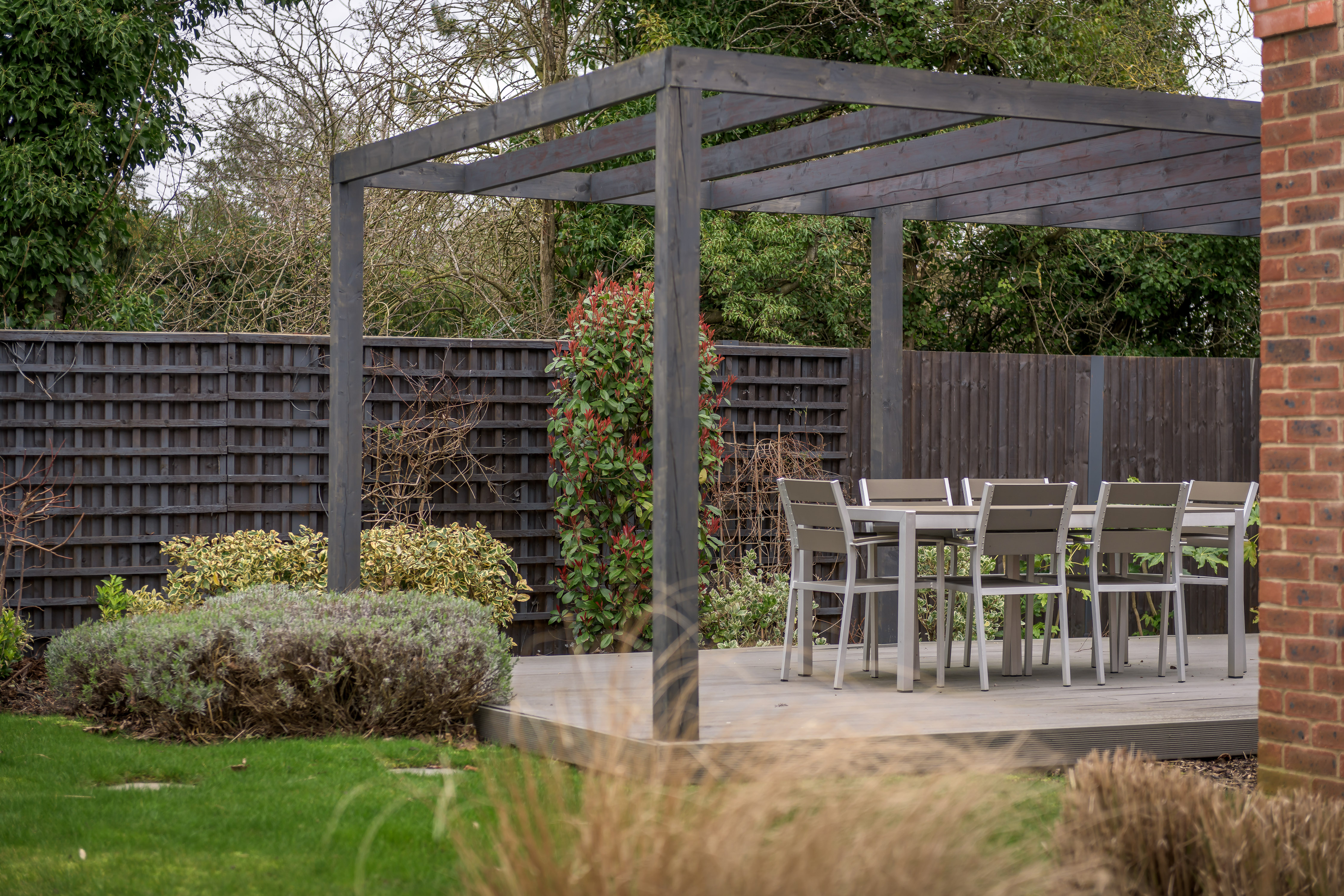 The gardens were landscaped by Bellway, with various shrubs and a mature olive tree, and a gardener maintains them. Seating areas are set around the good-sized lawn, with the pergola-covered deck the largest, and a smaller circular patio to one corner. The front of the plot is edged by a strip of water, hence Moat Reach, and the owners enjoy watching ducks make their way over.