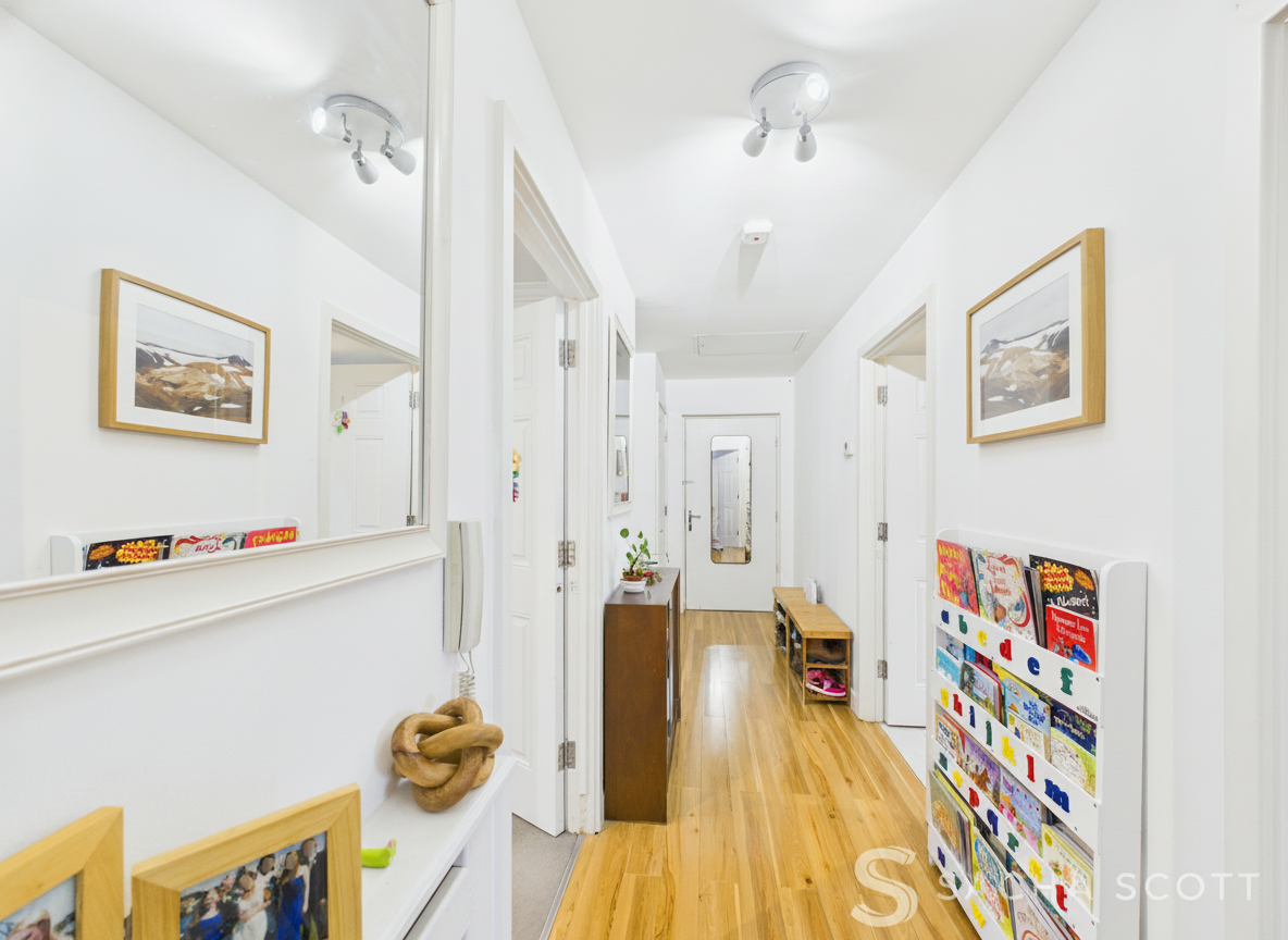 This wide and welcoming entrance hall offers neutral decor, laminate flooring, plenty of space for hall furniture and a storage cupboard.