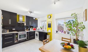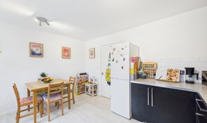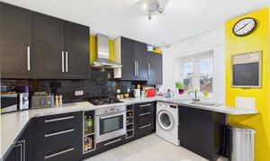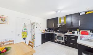 Offering plenty of room for a dining set, this spacious kitchen also benefits from good natural light from two windows, ample storage and work surface space and room for all expected appliances. Offering modern decor and units, this lovely kitchen is generous and bright.