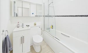 Part-tiled, the family bathroom offers a shower over bath with screen and a combination toilet/vanity sink with storage.