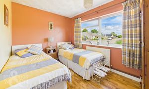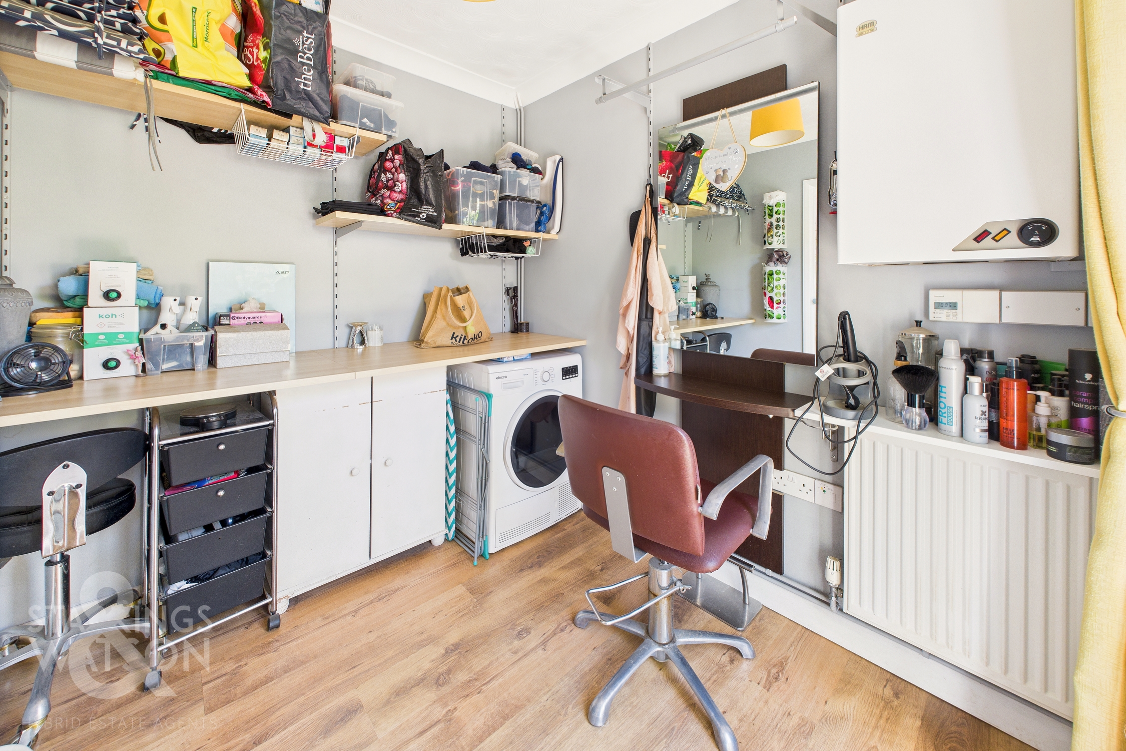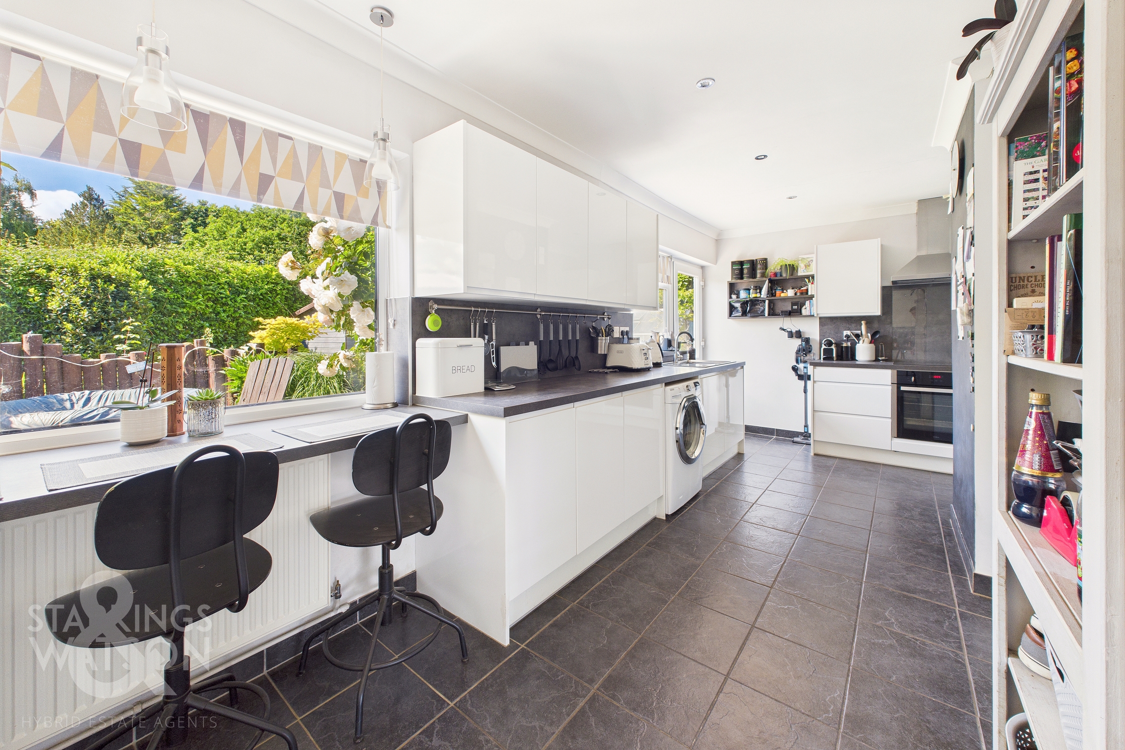Once inside, tiled flooring runs underfoot with doors leading to the bedroom accommodation and living space, with a built-in cloaks cupboard sitting opposite. The main sitting room offers a front facing full height window with wood effect flooring underfoot, ample space for soft furnishings and a dining table with an opening take you to the kitchen/breakfast room. This spacious, light and bright room offers extensive built-in storage with integrated cooking appliances including an inset electric ceramic hob and built-in electric oven with glass splash-back and extractor fan above, matching up-stands running around the work surface, with tiled flooring underfoot, built-in breakfast bar, integrated fridge freezer and space for a washing machine. A door leads out to the rear garden with a further door taking you to the adjacent utility room offering space for laundry appliances. This versatile room offers built-in shelving, oil fired central heating boiler and uPVC double glazed French doors leading, out creating a versatile space which could be a home office or garden room if required. The bedroom accommodation are all finished with wood effect flooring underfoot and uPVC double glazing with the main bedroom sitting adjacent to the garage, offering potential to convert further space and create an ensuite if required (stp). Serving all three bedrooms is the family bathroom which has been updated to include a white three piece suite with storage under the hand wash basin, shaped panelled bath with a mixer shower tap, tiled splash-backs, heated towel rail, and built-in airing cupboard.