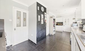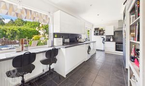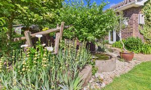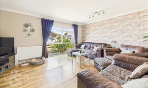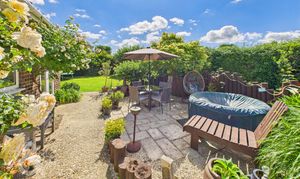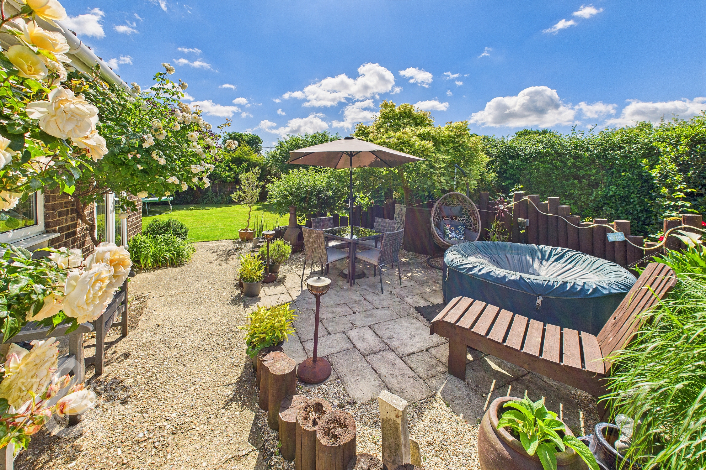 Set back from the road and approached via a shingled front garden with a variety of planting, twin hard standing driveways offer ample off road parking with a detached garage and adjoining single garage. Gated access leads to the rear garden, whilst a brick-weave pathway takes you to the main entrance door.