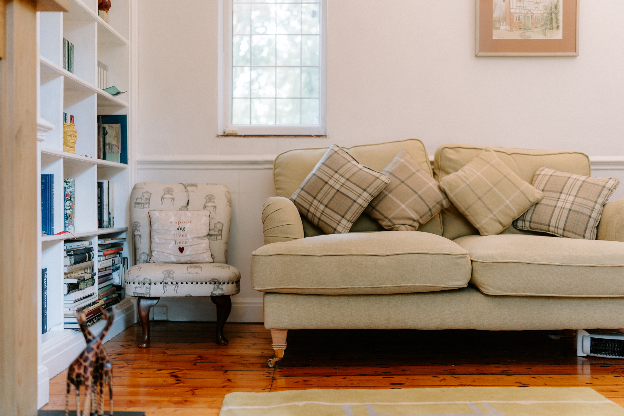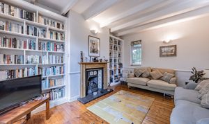 Inside, to the left of the entrance sits a characterful front living room. Original wooden floors flow through the hall and lounge, complemented by a working gas coal fire set within a restored fireplace, flanked by built-in bookshelves. The dual-aspect room overlooks both front and rear gardens, and the original beamed ceiling adds depth and warmth.