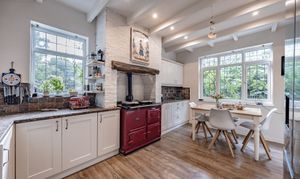 - Warm & Inviting Country Kitchen Features a gas-fired Aga, granite worktops, butler sink, and dining area overlooking the front garden.