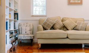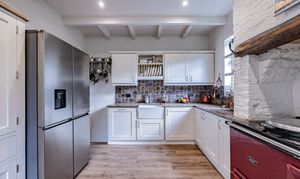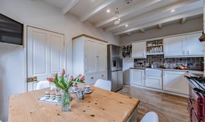 A solid wood, extra-large red front door welcomes you into this unique home, its bell still the original servants’ hall bell, now charmingly repurposed as the front doorbell. To the right of the entrance lies the heart of the home; the warm and welcoming kitchen. Featuring a country-style design, the kitchen boasts a gas-fired Aga (used purely for cooking and vented to the chimney, acting as an extractor), a granite worktop, a butler-style sink, free-standing fridge freezer, Indesit dishwasher, and built-in washing machine and dryer. A freestanding larder cupboard offers additional storage. The dual-aspect windows fill the room with natural light, and exposed beams add rustic charm. The laminate wood flooring continues underfoot, beneath which lies a hidden Indian stone floor. A dining area sits beside a window overlooking the picturesque front garden, providing a peaceful space to enjoy meals. The kitchen is naturally cosy and warms the bedroom directly above.